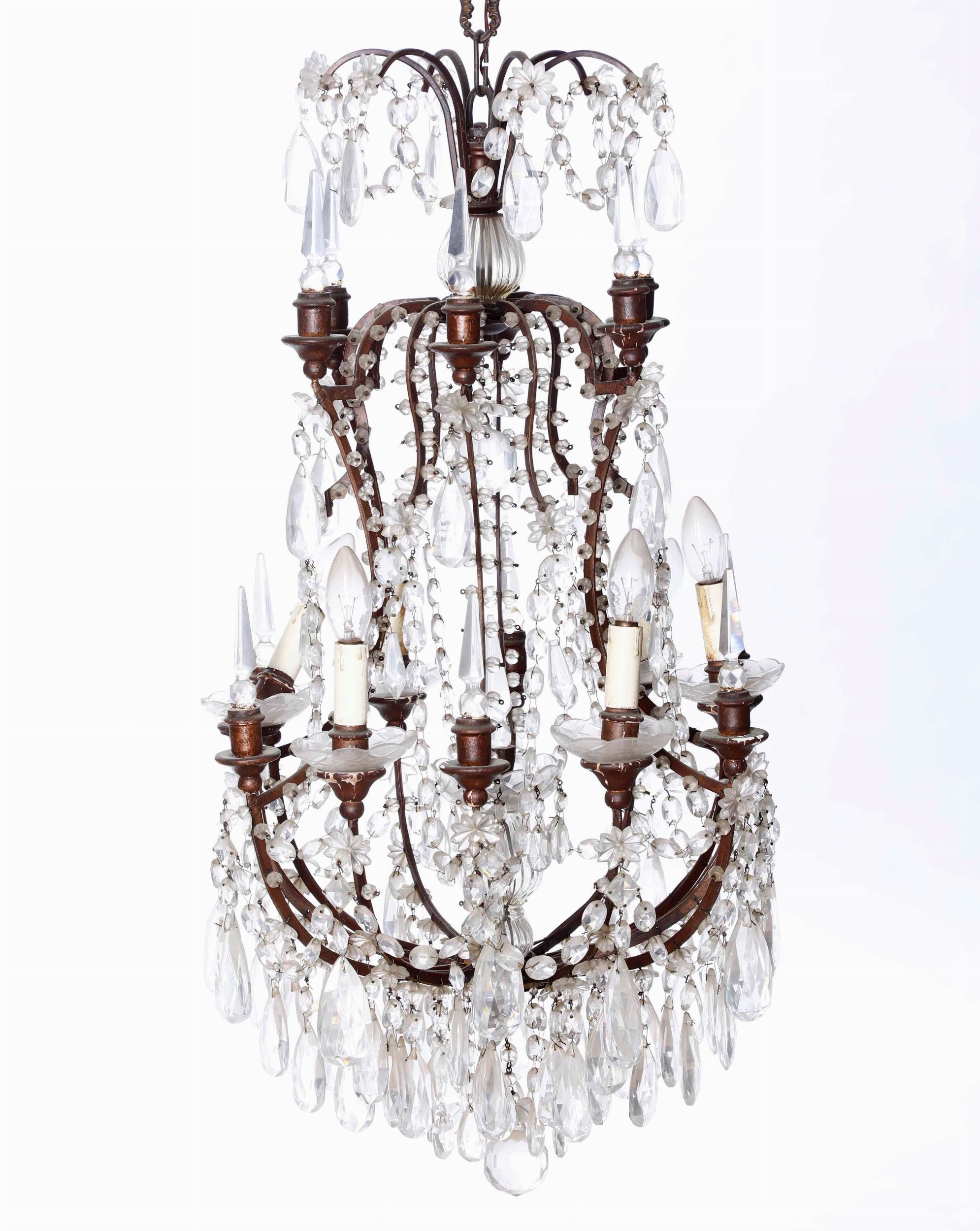 Coppia di lampadari a sei luci in metallo e cristalli. XIX secolo