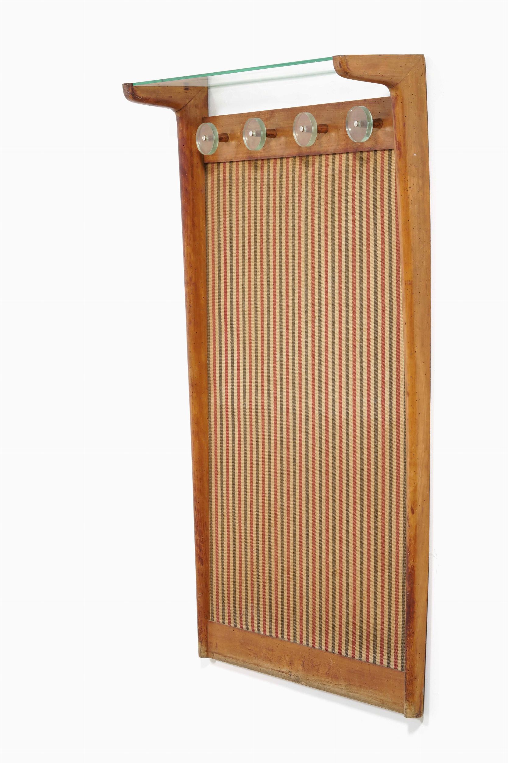 Parete appendiabiti in legno con prese e mensole in vetro di forte spessore