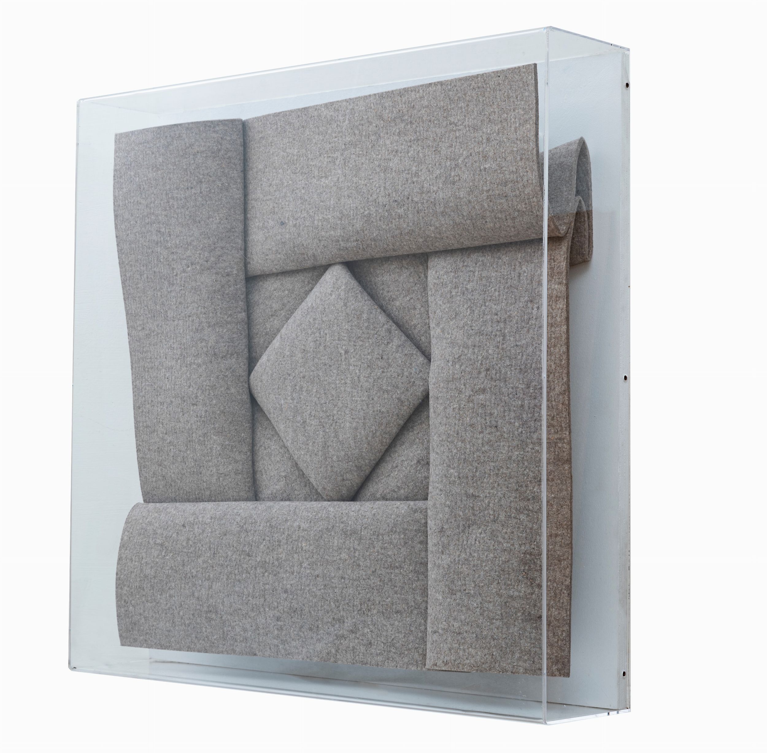 feltro sagomato riportato su tavola entro teca in plexiglass, cm. 71x71x17