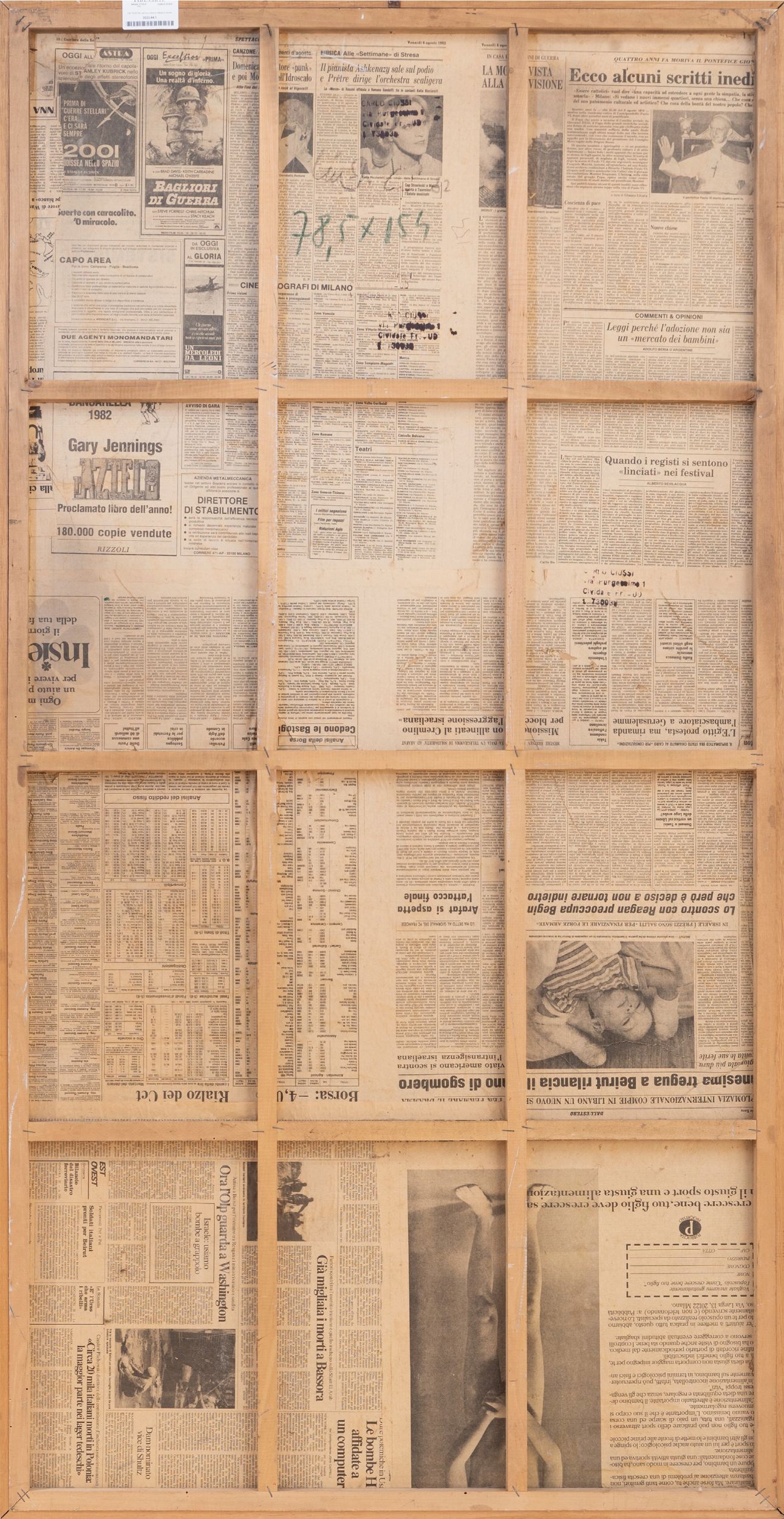 tecnica mista su carta da giornale e collage riportato su tavola, cm. 154x78,5