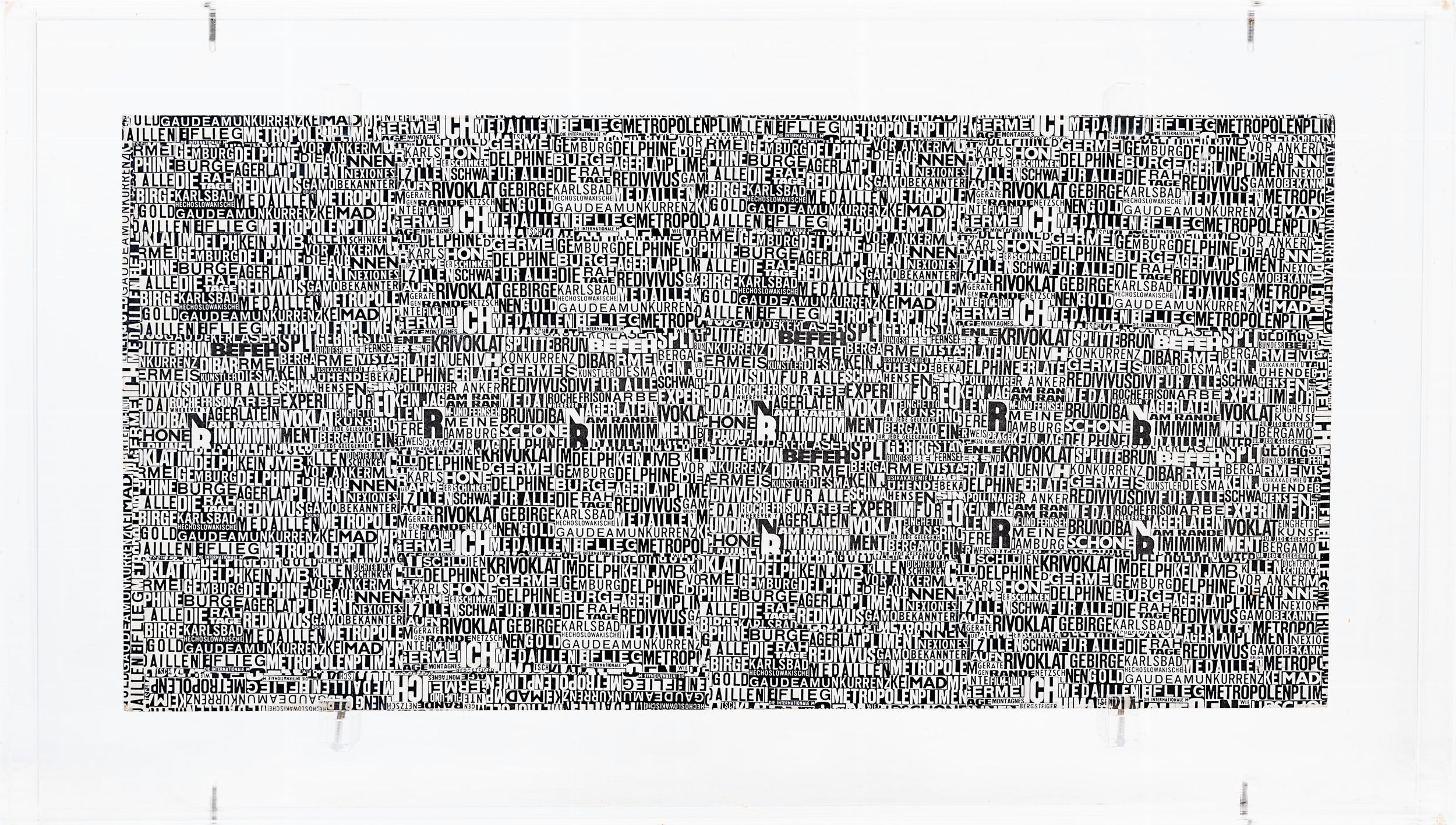 collage su tavola entro teca in plexiglass, cm. 28x57 - cm. 68x39x7,5 (teca)