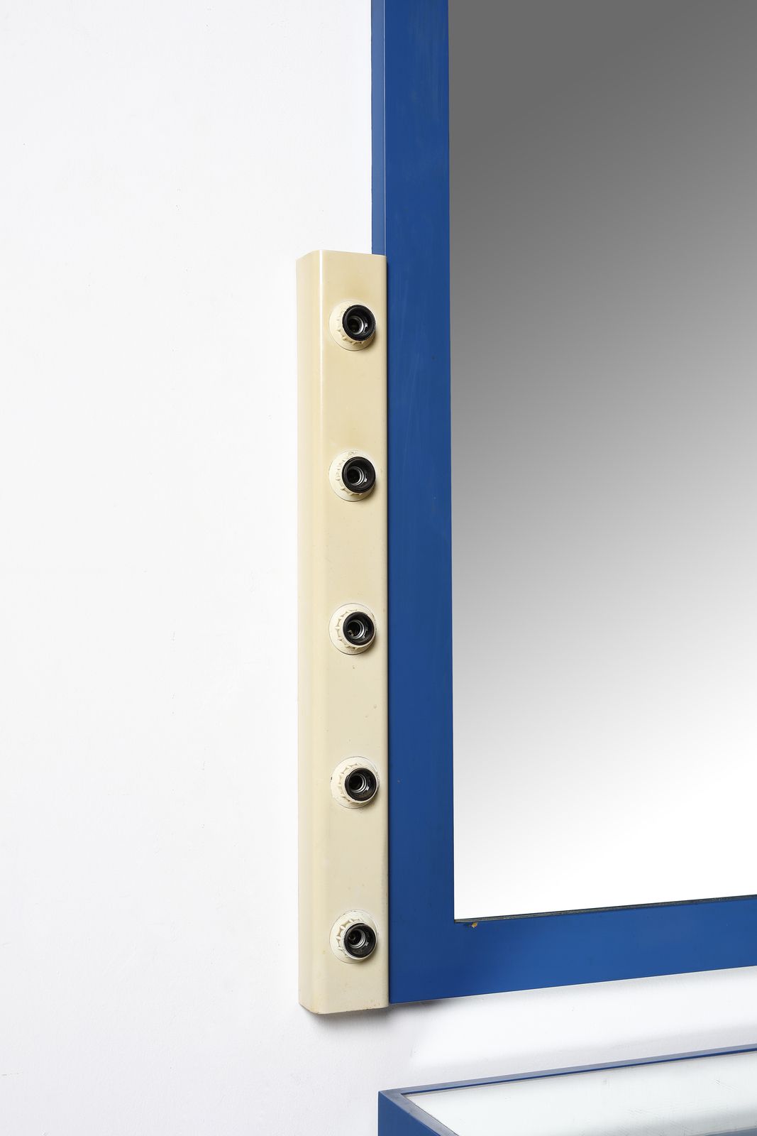 Mobile da toeletta con specchio e pouf, a lato lampade di GinoSarfatti per Artel [..]