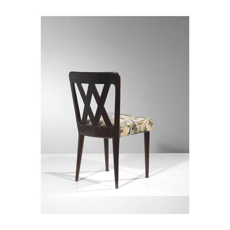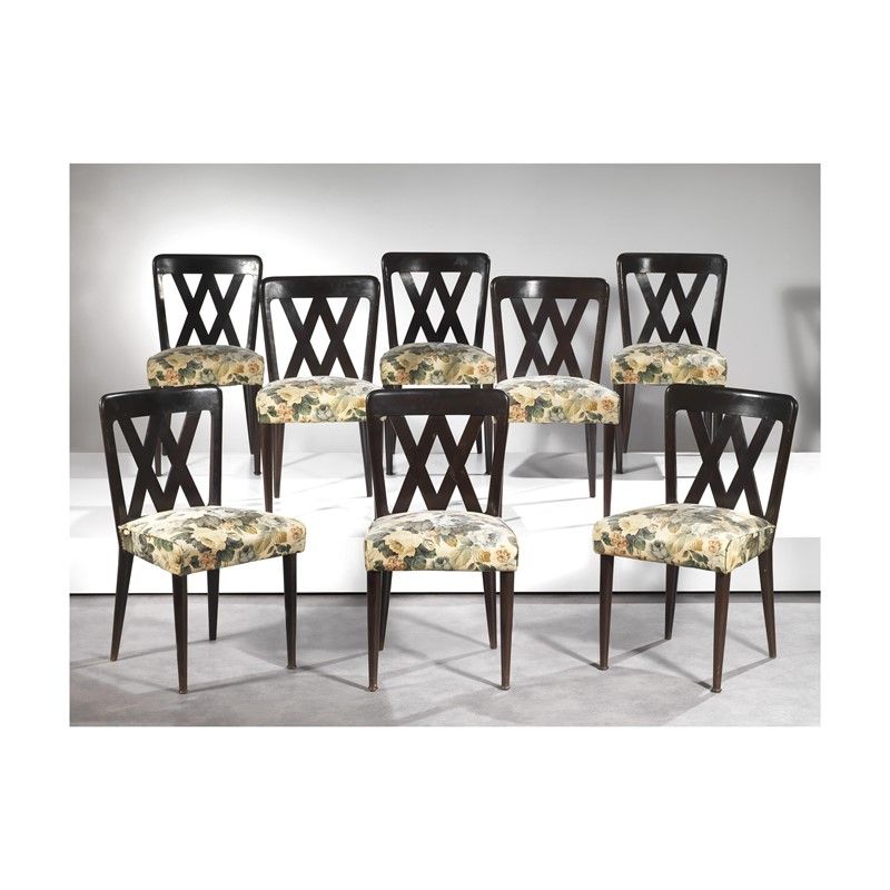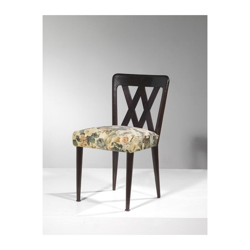 EIGHT CHAIRS, WOODEN STRUCTURE, FLOWERS FABRIC SEAT UPHOLSTERY