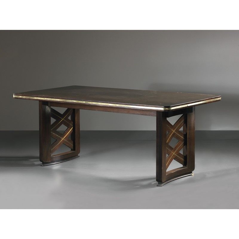 Mario Quarti (Varedo, 1911 - Milano,1985) TAVOLO in legno impiallacciato con decori geometrici in ottone, due cassetti sul lato corto sotto il piano Produzione Quarti, Italia, 1940 circa cm H80xL199xP99