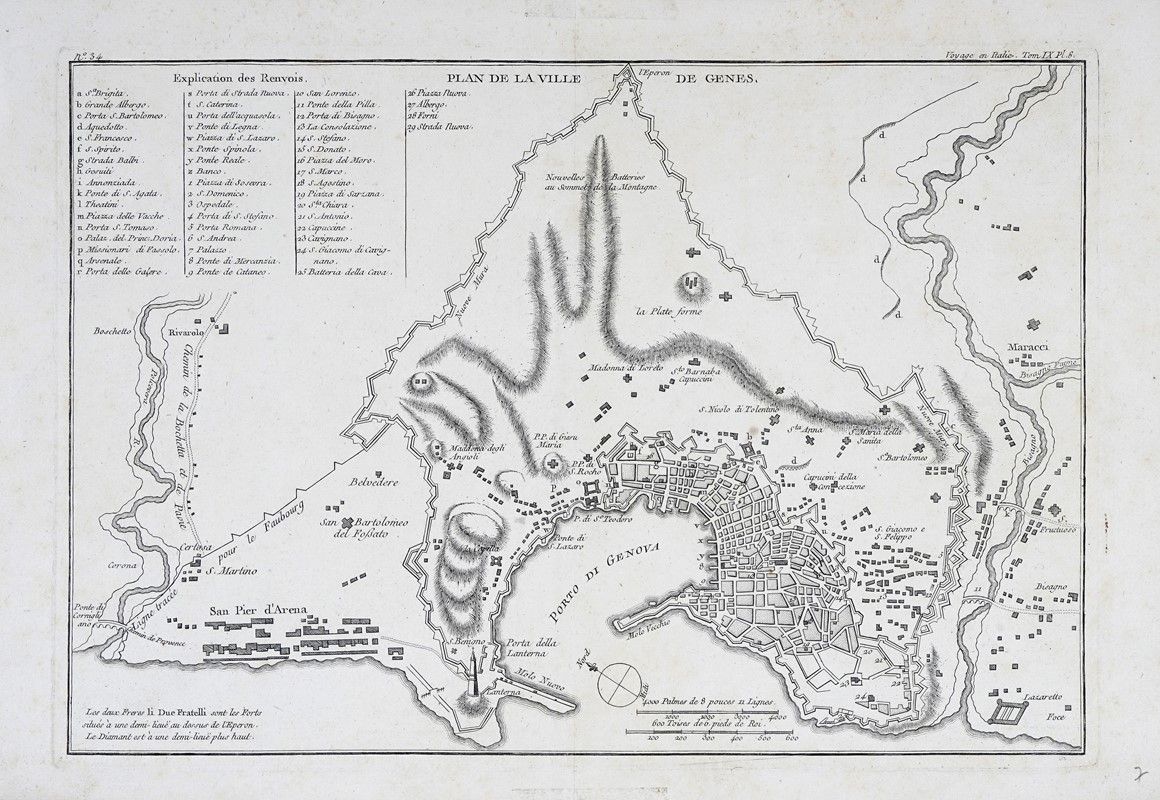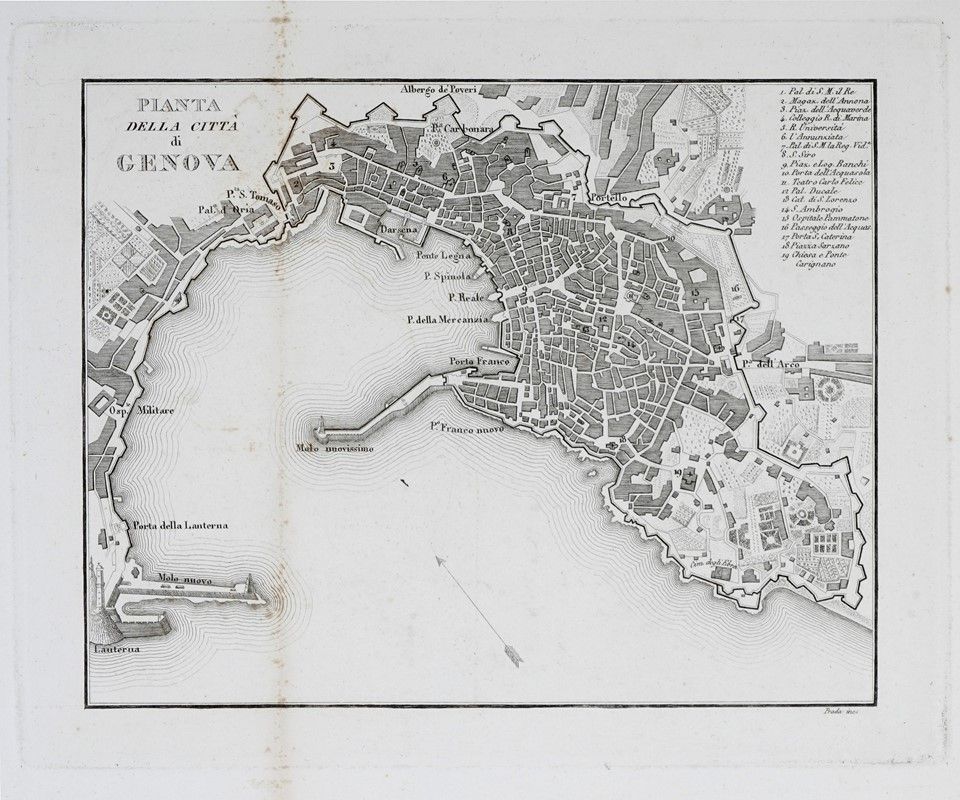 Incisione in rame. mm 195x267. Foglio: mm 235x298. Da J. Stockdale, A geographical, historical and political description of the Empire of Germany, Holland...Italy..., London 1800. SI AGGIUNGONO: J.J. De La Lande, Plan de la Ville de Genes. Incisione in rame. mm 258x373. Foglio: mm 297x428. Da Voyage en Italie, Parigi 1786. / Gandini - Prada. Pianta della Città di Genova. 1833. Incisione in rame. mm 190x238. Foglio: mm 250x265.