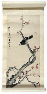 Pennello e acquerello a colori su seta applicata a carta di riso. Bastoni in legno con teste decorate per avvolgere [..]