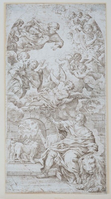 Penna e inchiostro bruno su carta vergellata sottile con filigrana "testa coronata entro ovale". In basso a sinistra a penna e inchiostro bruno "Pietro Palmieri fece". mm 423x224. Dal dipinto di Pietro da Cortona eseguito tra il 1663 e il 1664 per la chiesa veneziana di San Daniele e oggi conservato presso le Gallerie dell'Accademia (inv. 754).