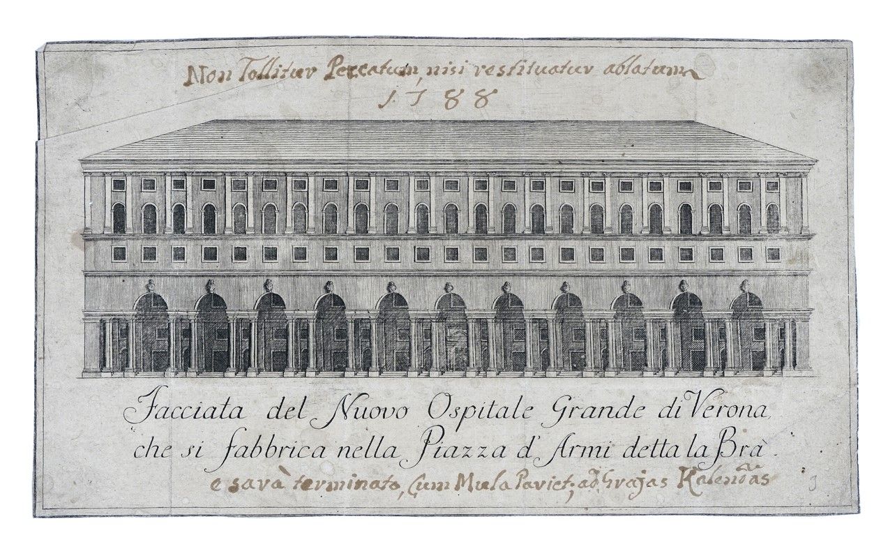 Acquaforte. mm 368x303. Foglio: mm 565x400. In basso a sinistra "A. Cristofali del." e a destra "Urbani Sculp.". Bella veduta dell'anfiteatro e pianta, oltre vedute di altri monumenti, con legenda esplicativa in 17 richiami in basso. SI AGGIUNGE: Facciata del Nuovo Ospitale Grande di Verona, che si fabbrica nella Piazza d'Armi detta la Bra. Bulino. mm 173x293. Con nota manoscritta a penna e inchiostro bruno e la data "1788".