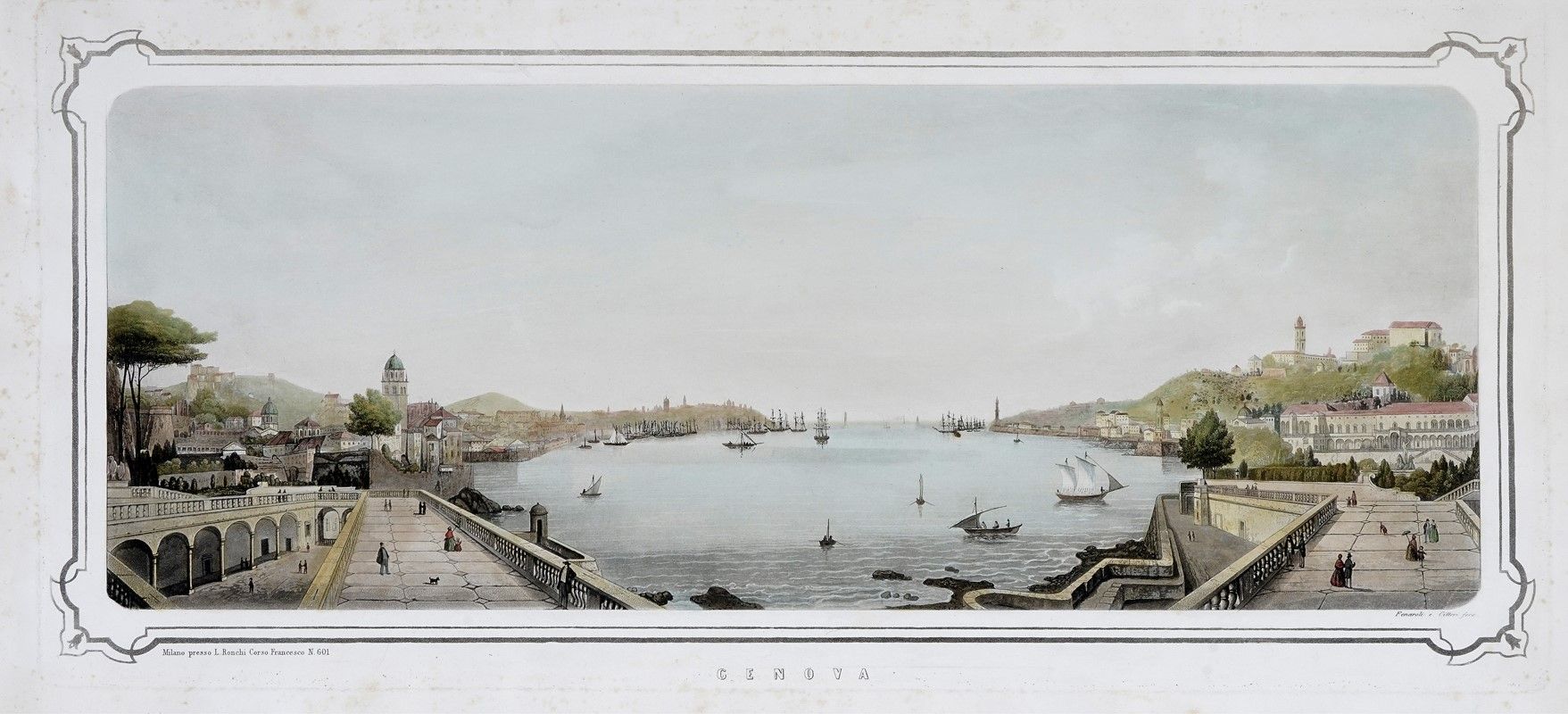 Acquaforte e acquatinta a colori. mm 250x550. Foglio: mm 350x630. Bellissima e rara veduta di Genova presa dai giardini di Palazzo Doria firmata da Fenaroli e Citteri in basso a destra per la tipografia Ronchi di Milano. La veduta reca in basso l'indirizzo "Corso Francesco N. 601" quindi databile a prima del 1869, quanto la tipografia iniziò a stampare con indirizzo "Milano Ronchi Editore Negozio Corso Vittorio Emanuele 99 - Stabilimento Via S. Pietro all'Orto 11".