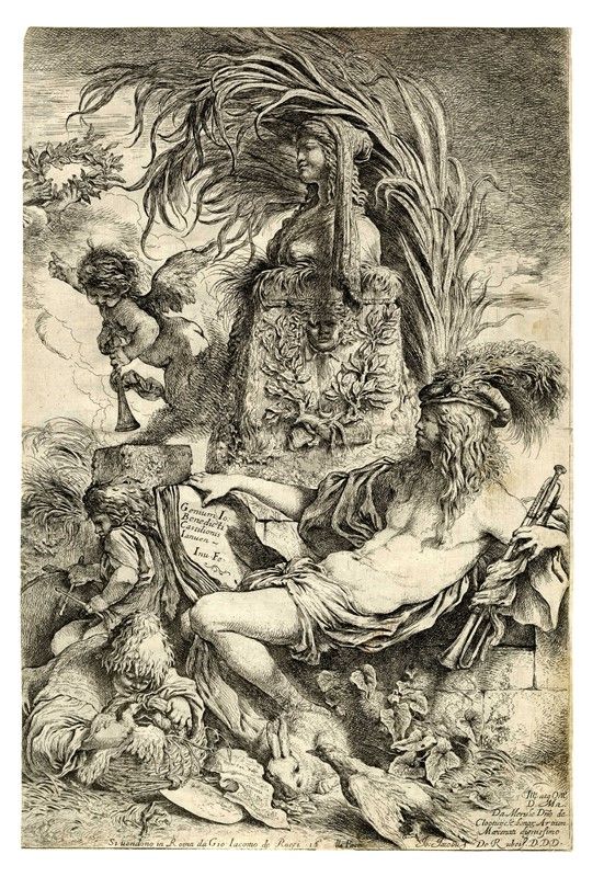 Acquaforte. mm 361x242. Bartsch, XXI, 23. Bellini (Castiglione), 56. Sul volume il titolo e la firma "Genium Io: Benedicti Castilionis Ianuen Inv. Fe.". All'angolo inferiore destro dedica a Matthys van de Merwede firmata da De Rossi. III e definitivo stato con in basso l'indirizzo "Si vendono in Roma da Gio: Iacomo de Rossi" seguito dalla data "1648" e dal luogo "alla Pace". Bellissima impressione brillantemente inchiostrata su carta vergellata apparentemente priva di filigrana. Al verso marchio di collezione non identificato con iniziali "A.B." (Lugt, 3049).