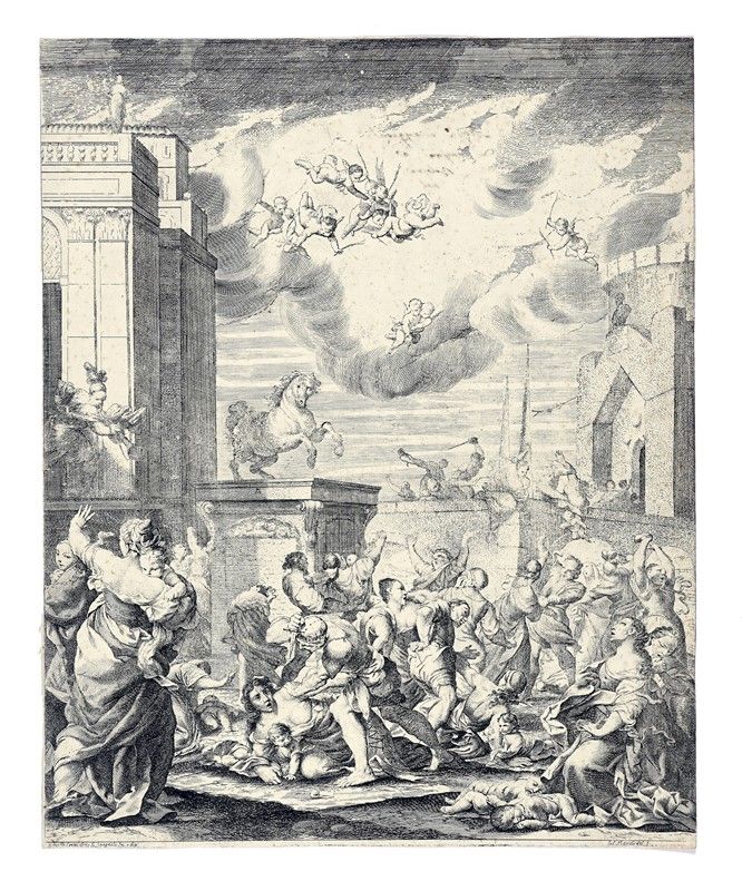 Acquaforte. mm 404x326. Bartsch, XIX, 3. Al piccolo margine in basso da sinistra a destra "Gioseffe Crespi detto lo Spagnolo inv e dip" e "Lodovico Mattioli del f". Incisione simile alla versione dipinta conservata nella quadreria di Palazzo Magnani a Bologna ed eseguita per gli Aldrovandi. Anche se l'indicazione di responsabilità per l'intaglio indica Ludovico Mattioli pare che, oltre all'invenzione, sia da ascrivere al Crespi anche l'esecuzione dell'inciso. Ottima prova su carta vergellata pesante con filigrana "piccolo fiore di giglio in cerchio singolo". Al verso nota di possesso a penna e inchiostro bruno "Aless. Maggiori comprò a Bologna nel 1794" (Lugt, 3005b).