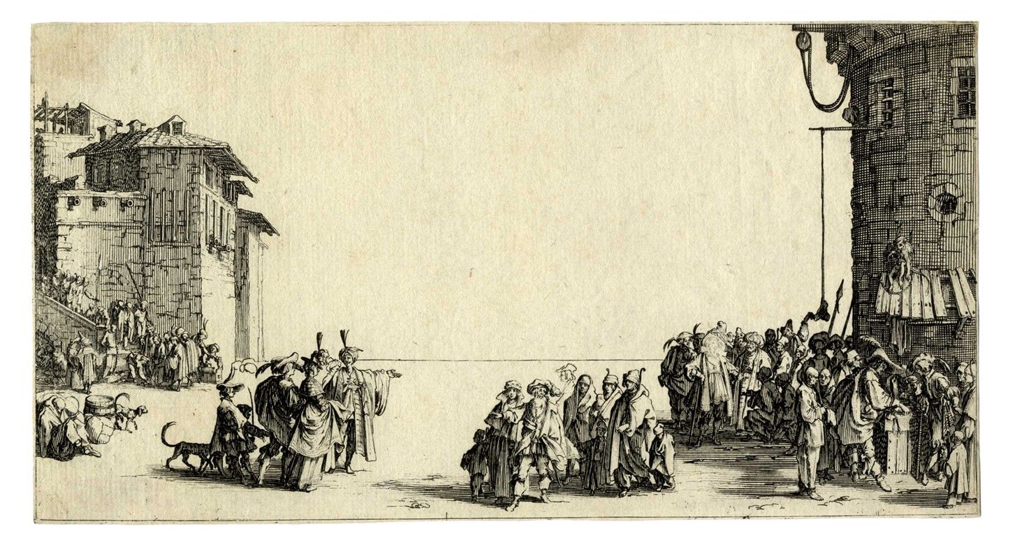 Acquaforte. mm 114x217. Lieure, 369. Bellissima prova, nel raro I stato di 6, avanti il completamento della composizione per mano di altro esecutore, stampata con segno pieno su carta vergellata sottile con filigrana "corno da caccia" (Lieure, 47) come segnalato da Lieure per questo stato.