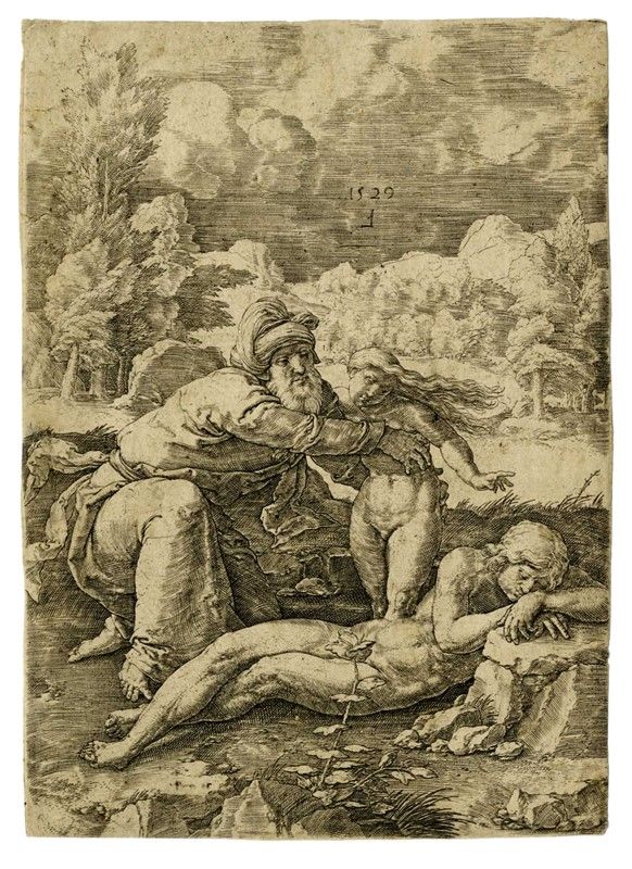 Bulino. mm 163x117. New Hollstein, 1. Con il monogramma in controparte e la data "1529" in alto al centro. Tavola dalla serie di 6 La creazione di Adamo ed Eva. Ottima impressione nello stato definitivo su carta vergellata sottile priva di filigrana.