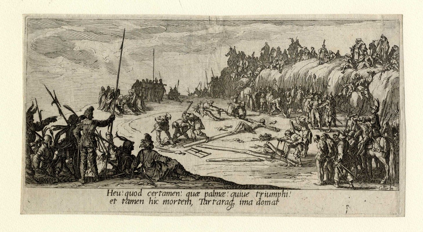Acquaforte e bulino. mm 95/99x211/215. Lieure, 281-287. Serie completa in sette tavole eseguite tra il 1619 e il 1624. Ottime prove nel II stato di 4 (Lieure, 281 e 284), I stato di 2 (Lieure, 283 e 287), I stato di 3 (Lieure, 282, 285 e 286). Filigrane "doppio C di Lorena" (Lieure, 29 e 30), "corno da caccia" (Lieure, 44-47), "leone con stella" (Lieure, 38). Al verso della tavola Lieure 282 marchio della collezione di Alessandro Castagnari mercante d'arte romano (Lugt, 86a).
