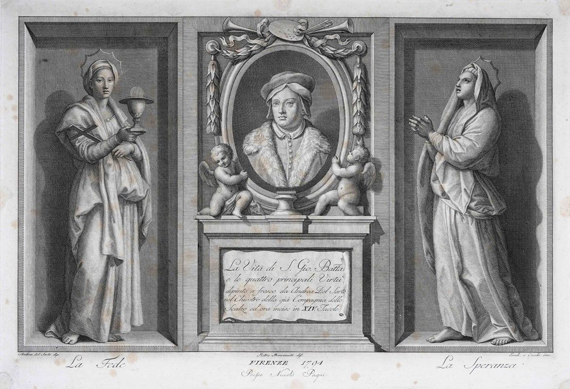 Bulino. mm 378x549. Foglio: mm 382/384x390/555. Serie completa e omogena in 14 tavole compreso frontespizio realizzata, su disegni di Pietro Benvenuti, da vari incisori tra i quali Giovanni Battista Cecchi, Carlo Bozzolini, Angelo Volpini (1760-1835 ca.), Giuseppe Pera, Luigi Sabatelli.