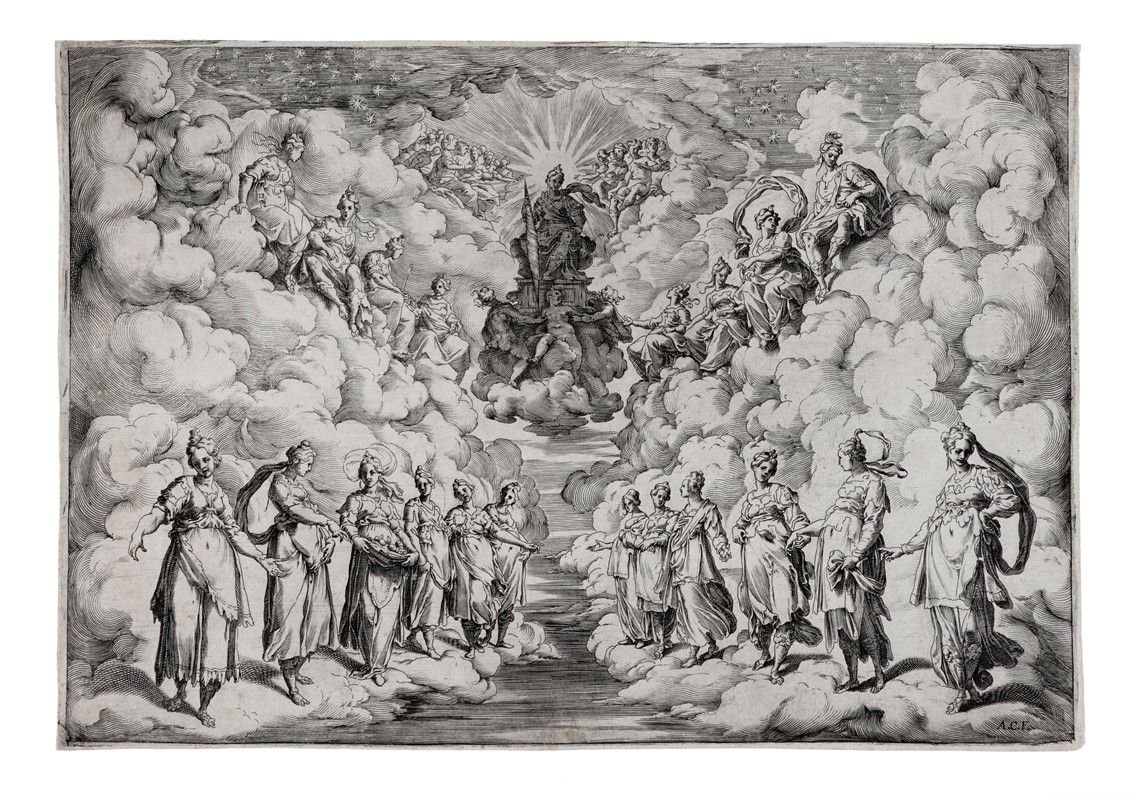 Acquaforte e bulino. mm 240x348. Foglio: mm 244x353. Bartsch,121. DeGrazia, 153. Da invenzione di Bernardo Buontalenti. La stampa, assieme all'Apollo e il Drago, costituisce la scenografia del primo dei sei intermezzi dell'opera di Girolamo Bargagli "La Pelllegrina", rappresentata il 2 maggio del 1589 a Firenze, durante i festeggiamenti per le nozze di Ferdinando I de' Medici e Cristina di Lorena. Ottima prova nel III stato di 3 dopo l'abrasione dell'indirizzo di Filippo Suchielli in basso al centro su bella carta vergellata sottile con filigrana "pellegrino con pastorale in verticale entro ovale" simile a Woodward 23 (Siena, 1590 ca.). Al verso nota a penna e inchiostro bruno "P. Mariette 1668" (Lugt, 1790).