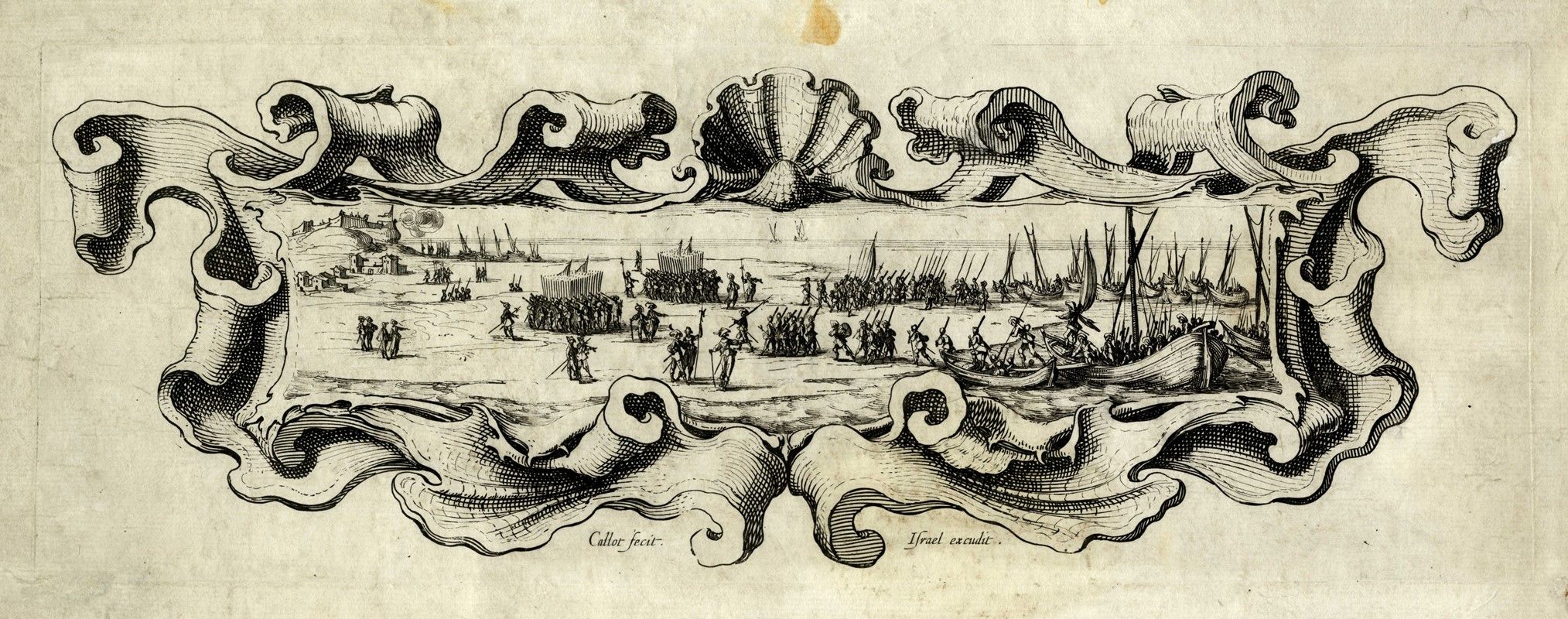 Acquaforte e bulino. mm 140x385. Foglio: mm 166x412. Lieure, 653. Sulla lastra in basso al centro la firma e l'excudit di Israel. Bellissima prova, brillantemente inchiostrata, nel I stato di 3, priva ancora del leggero tratto di inquadramento, e prima della cancellazione dell'excudit di Israel e della riduzione della lastra. Carta vergellata sottile priva di filigrana.