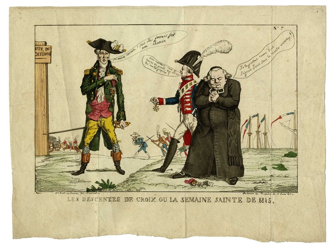 Acquaforte in coloritura. mm 255x355. Foglio: mm 265x358. Al margine inferiore a sinistra "Se vend au bureau du Journal" e a destra "Se trouve au numéro du 15 Juin 1815.", al centro il titolo. Stampa satirica sul ritorno di Napoleone I in Francia dalla serie Retour de l'île d'Elbe e pubblicata in Le Nain Jaune, ou Journal des Arts, des Sciences et de la Littérature. Il giornale sostenne Napoleone durante i cento giorni e fu soppresso al secondo ritorno dei Borboni, il 15 luglio 1815.