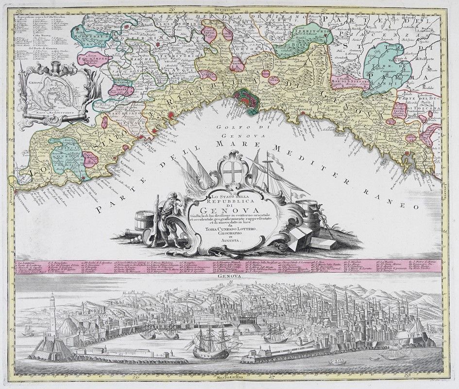 Incisione in rame in coloritura. mm 498x585. Foglio: mm 573x705. Mappa di grande impatto con elaborato cartiglio al centro contenente il titolo, altro in alto a sinistra con una pianta delle fortificazioni della città di Genova. In basso bella veduta della città presa dal mare con legenda dei luoghi a 64 voci.