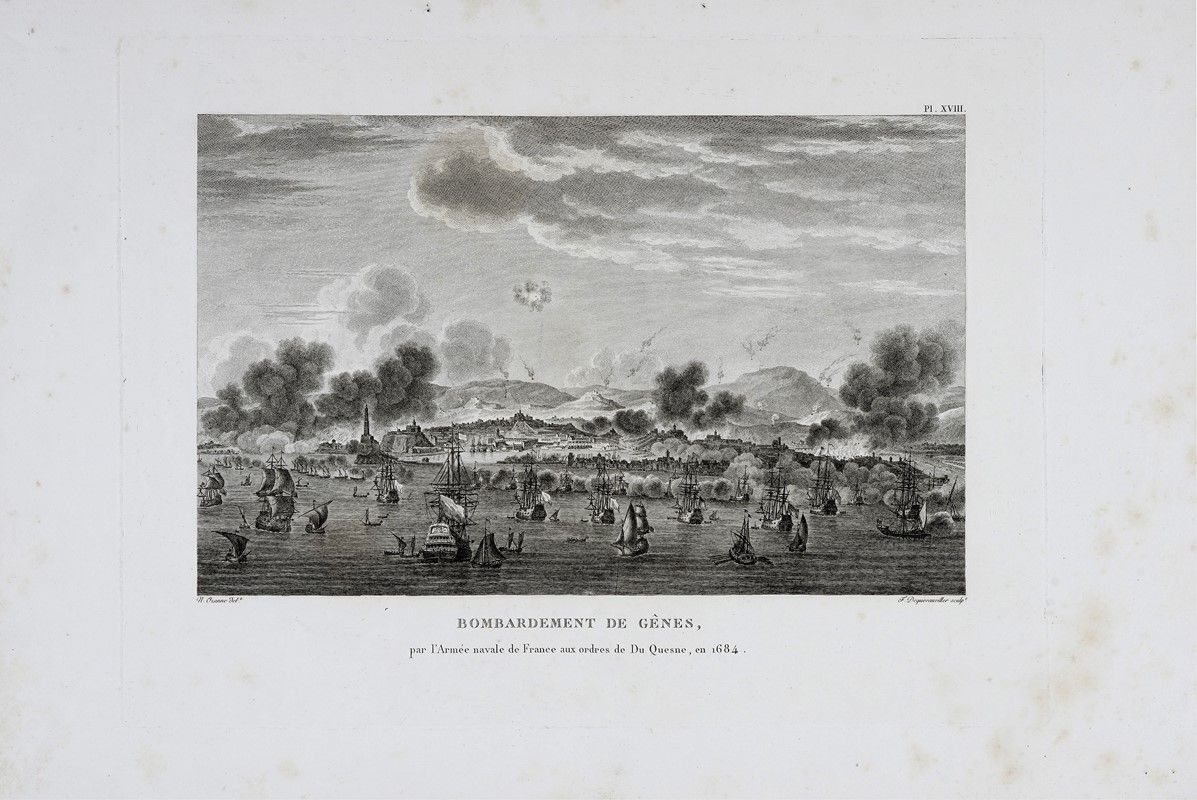Tecniche e dimensioni varie. Si segnalano: Francois Jacques Dequevauviller (1745-1807), Nicolas Ozanne. Bombardement De Gênes, par L'Armée navale de France aux ordres de Du Quesne, en 1684 .1797. Bulino. mm 290x390. Foglio: mm 370x550 / Pierre-Gabriel Berthault (Saint-Maur-des-Fossés, 1737 - Paris, 1831) Massacre de l'equipage de la Modeste, dans le Port de Genes, par les Anglaisnle 5 Octobre 1793. 1788-1798. Bulino. mm 238x295. Foglio: mm 315x500 / Joseph Skelton (1785-1850), Défense De Gênes (25 Mai 1800). Bombardement de la ville par les Anglais. 1830. Da Galeries historiques de Versailles, presso Charles Gavard, 1830. mm Foglio: mm 224x305. Foglio: mm 395x560 / Litografia C. Perrin, Torino, Partenza da Genova di Garibaldi e de' suoi Mille per la Sicilia. 1861. Litografia a colori. mm 160x235. Foglio: mm 245x330.