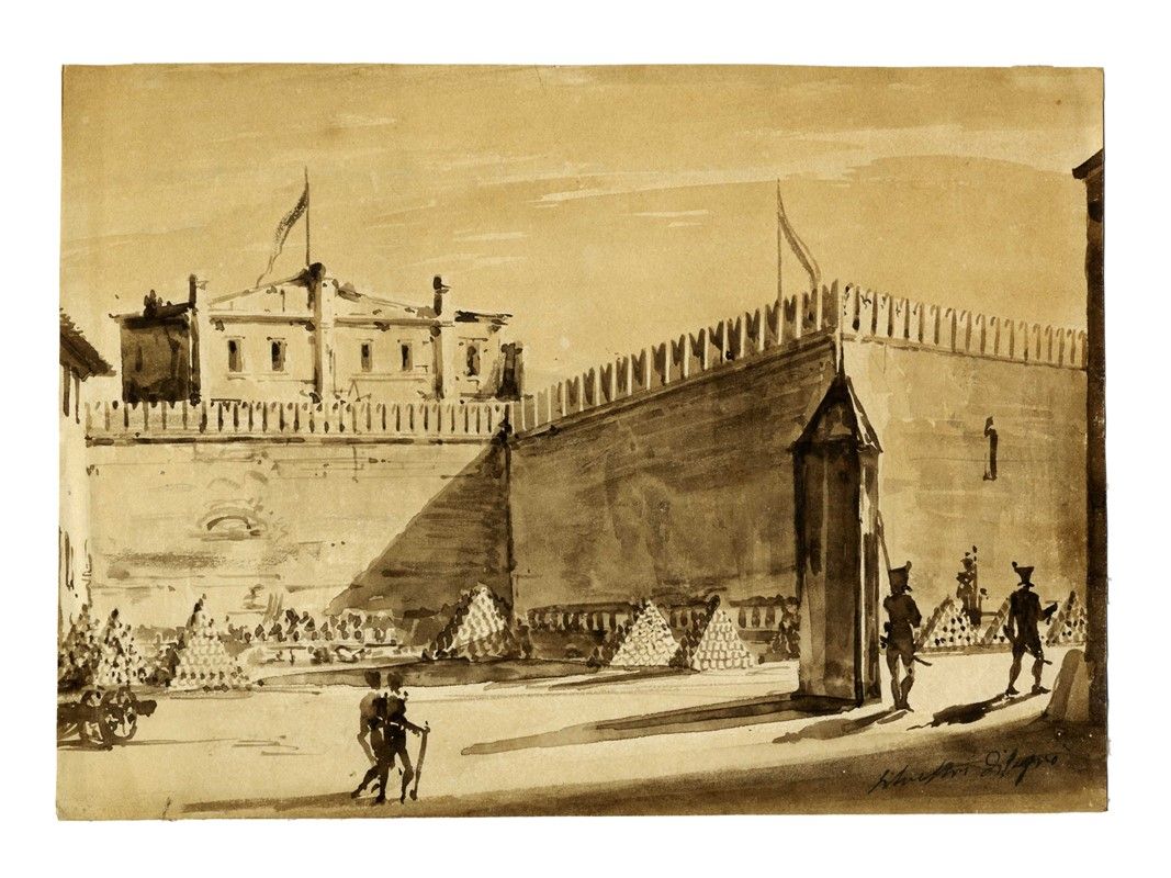 Pennello e acquerello nero e grigio, rialzi in bianco. Firmato in basso a destra "Silvestri disegnò". mm 180x245.