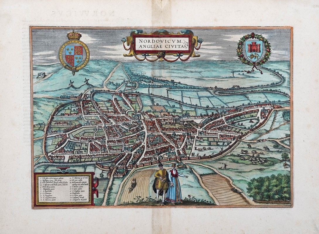 Incisione in rame in coloritura. mm 296x421. Foglio: mm 392x530. Testo latino al verso. Pianta a volo d'uccello della città di Norwich alla fine del XVI secolo, dal terzo volume del Civitates Orbis Terrarum. La città è vista da ovest, con la Cattedrale e il Castello al centro. Si distinguono le mura medievali e il fiume Wensum attraverso i campi. In primo piano, un uomo e una donna in abiti eleganti attestano l'importanza della città in epoca tardo medievale e Tudor. La mappa è arricchita dai cartigli con il ??titolo, la legenda e lo stemma reale e quello della città.