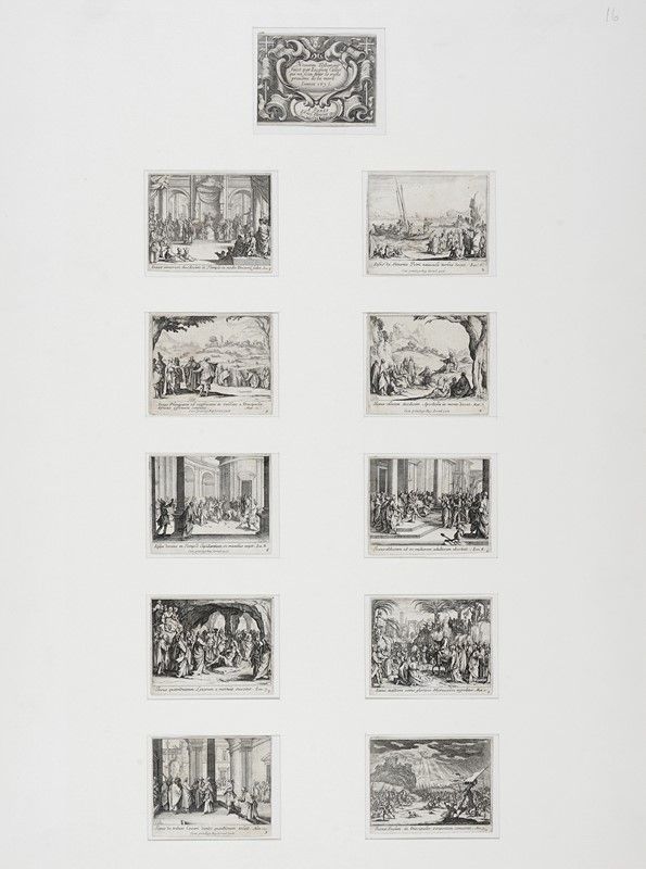 Acquaforte. mm 90x70. Lieure, 1418-1427. Serie completa in 10 tavole compreso frontespizio, inciso postumo da Abraham Bosse per l'edizione stampata da Israel a Parigi. Ottime prove nello stato definitivo dopo la comparsa della numerazione, su carta vergellata spessa.