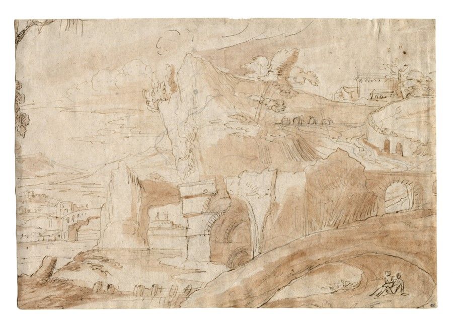 Penna e inchiostro bruno, pennello e acquerello seppia, tracce di matite di grafite, rialzi in bianco su carta vergellata color avorio. mm 235x345. All'angolo inferiore destro marchio della collezione di Paul Mathias Polakovits (Budapest 1921-Paris 1987), Lugt 3561. Provenienza: Sotheby's, Amsterdam, 15/11/1995, lotto 52. Christie's, South Kensington, 09/07/2009, lotto 532. Italia, collezione privata.