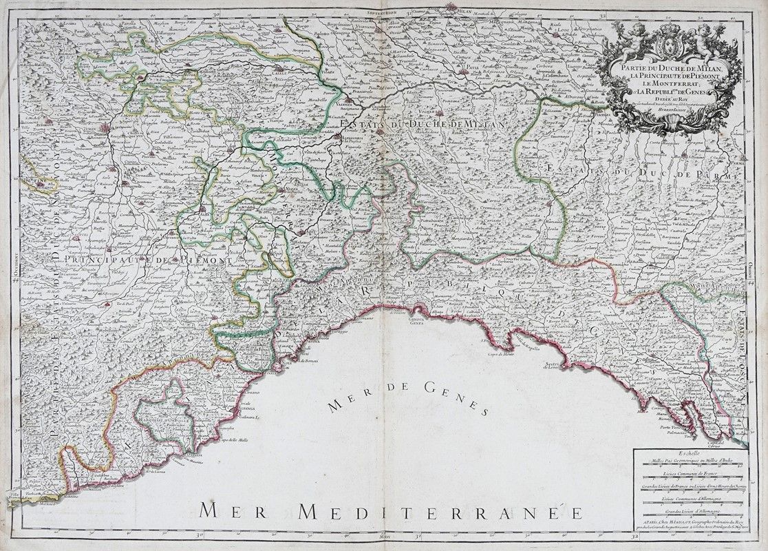 Incisione in reme con confini in coloritura. mm 468x655. Foglio: mm 503x675. Da Atlas Geographique Contenant Les Cartes d'Espagne, de Portugal, et d'Italie ; où sont les Etats de Piémont, de Gênes, de Milan, de Parme, de Modène, de Mantoue, de Venise, de l'Eglise, de Toscane, des Deux-Siciles, des Isles de Corse, et de Sardaigne , et de celle de Malthe. Tome XII. Nonostante il titolo la mappa descrive nel dettaglio tutto lo Stato della Repubblica di Genova. Nell'angolo in alto a destra è posto il cartiglio per il titolo con due putti che sorreggono lo stemma dei Borbone, in basso grande tabella per la scala miliare.