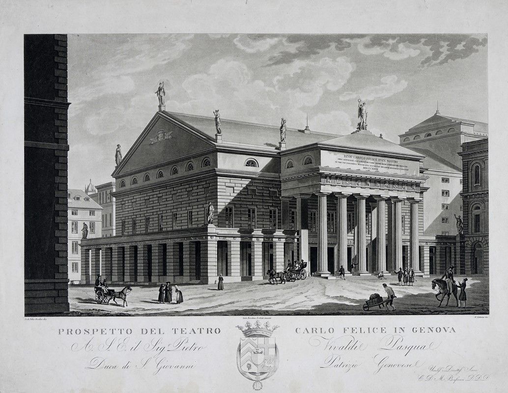 Acquatinta. mm 395x515. Foglio: mm 407x525. La tavola raffigura il prospetto del Teatro Carlo Felice progettato dall'architetto genovese Carlo Barabino tra il 1825 e il 1828, ed è stata intagliata dall'incisore Gaetano Cattaneo su disegno fornito dall'architetto Felice Orsolini. Le responsabilità compaiono al margine inferiore da sinistra a destra, al di sotto il titolo e la dedica a Pietro Vivaldi Pasqua duca di S. Giovanni Patrizio Genovese. Bella impressione su carta non vergellata priva di filigrana.