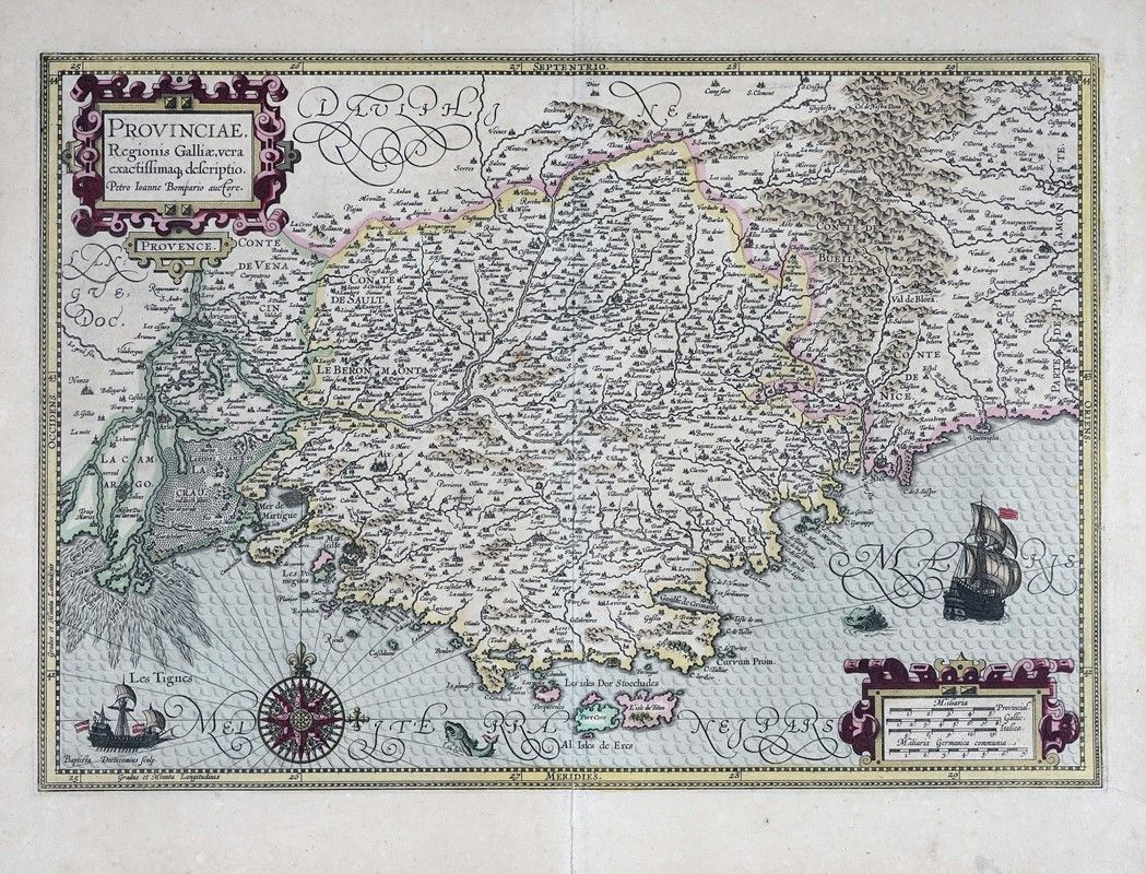 Incisione in rame. mm 357x515. Foglio: mm 455x575. Carta della Provenza, da Avignone al delta del Rodano fino a Saluzzo e Sanremo, tratta da quella di Pierre-Jan de Bompar del 1591. Numerosi elementi decorativi, vascelli, mostri marini, e calligrafia ornata, nello stile dell'autore dell'intaglio Baptista van Doethecum.