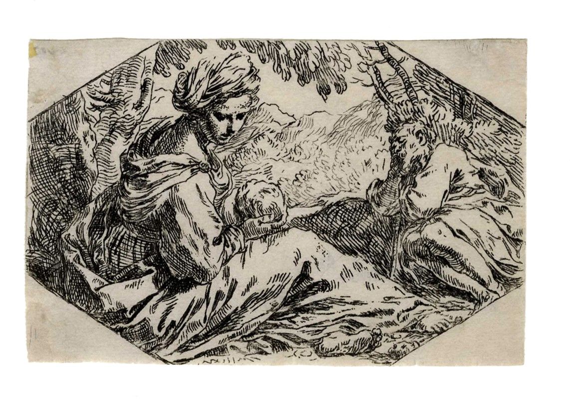 Acquaforte. mm 80x124. Bartsch, 7. Bellini (Cantarini), 16. Incisione in ottagono su lastra rettangolare senza alcuna sigla o iscrizione. Ottima prova nell'unico stato stampata con inchiostrazione brillante su carta vergellata sottile priva di filigrana.