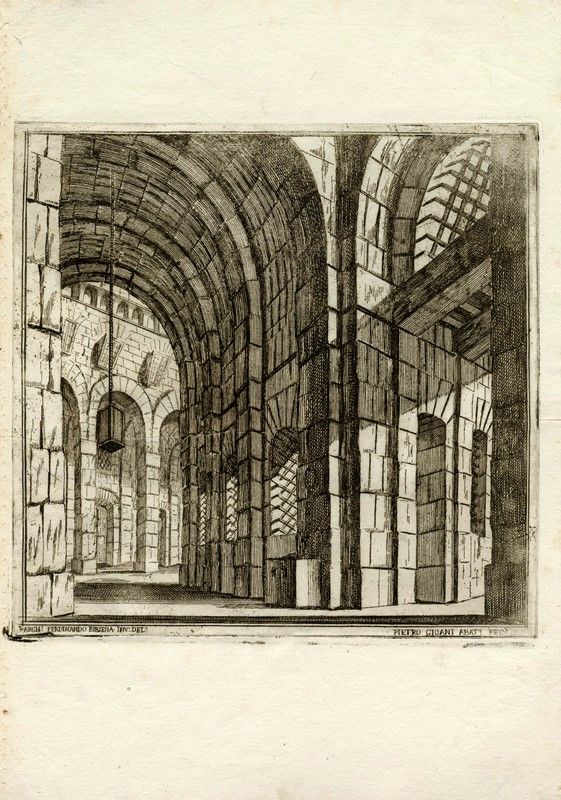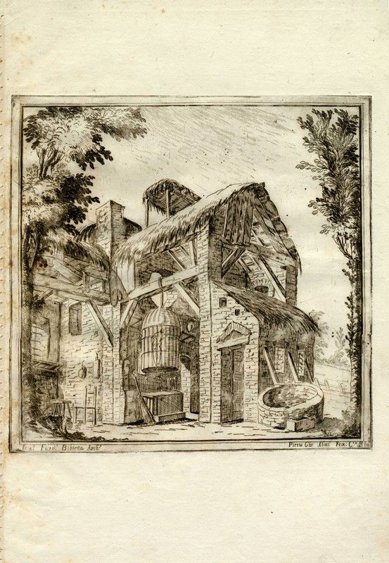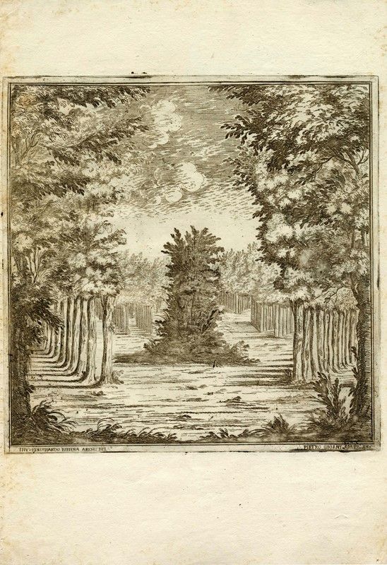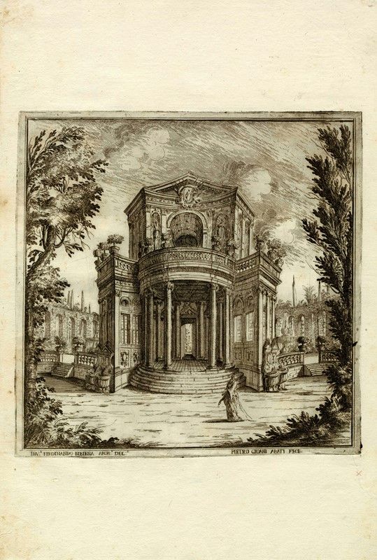 Acquaforte. mm 250/275x252/268. Foglio: mm 420x290. Al margine inferiore di ciascun esemplare le indicazioni di responsabilità, a sinistra il nome del Bibiena inventore e disegnatore e a destra il nome dell'Abbati che eseguì. Sette tavole, da una serie di 11 più frontespizio, che documentano le scenografie ideate dal Bibiena ed eseguite da Abbati per i due spettacoli carnevaleschi, Endimione ed Esione, rappresentati a Torino nel 1699. La serie venne inclusa nel 1717 nella seconda edizione di Varie opere di Prospettiua inventate da Ferdinando Galli d:o il Bibiena Bolognese...Giacomo Camillo Mercati in Bologna [1701]. 1) Facciata della reggia di Diana con fonti e platani (Endimione Atto I/scena prima). 2) Giardino su le rive del mare (Esione Atto II/scena terza). 3) Piazza con triplicate strade (Esione Atto I / scena prima). 4) Archi che corrispondono alle prigioni (Esione Atto III, scena terza). 5) Capanna di Silvano con Amore in una gabbia (Endimione Atto III/scena prima). 6) Città di Troia assediata, e assalita (Esione Atto II / scena quindicesima). 7) Piccol boschetto con fonti (Endimione Atto II/ scena seconda e Atto III/scena seconda). Bellissime impressioni stampate su carta vergellata sottile con filigrana "stella a otto punte" (Bologna, prima metà XVIII secolo), visibile su parte dei fogli. SI AGGIUNGE: Carlo Antonio Buffagnotti (Bologna 1660-Torino 1710). Capriccio architettonico con gruppo di sirene su basamento. Acquaforte su lastra ovale. mm 340x260. Foglio: mm 420x290.