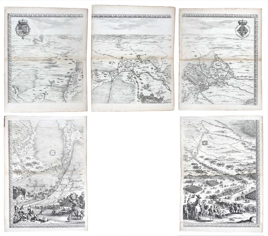 Acquaforte. mm 545/656x462/490. Lieure, 593. Cinque delle sei tavole (mancante la tavola centrale al registro inferiore) raffiguranti l'assedio di Breda, opera commissionata a Callot da Isabella Clara Eugenia d'Asburgo - infanta di Spagna e di Portogallo (Segovia, 1566 – Bruxelles, 1633), che governò, come principessa sovrana, i Paesi Bassi spagnoli - e pubblicata dall'editore Plantin ad Anversa. Bellissime impressioni, tre nell'unico stato (tavole in alto e in basso a sinistra e in alto a destra), in I stato avanti la grande banderuola con il titolo la tavola in alto al centro, in II stato la tavola in basso a sinistra dove oltre la firma "Iac. Callot in / et fecit" si legge "Israel Silvestre ex. Parisiis Cum privil. Regis". Carta vergellata con grande filigrana "croce di Malta entro corona di rosario con croce pendente" visibile su tutti i fogli.