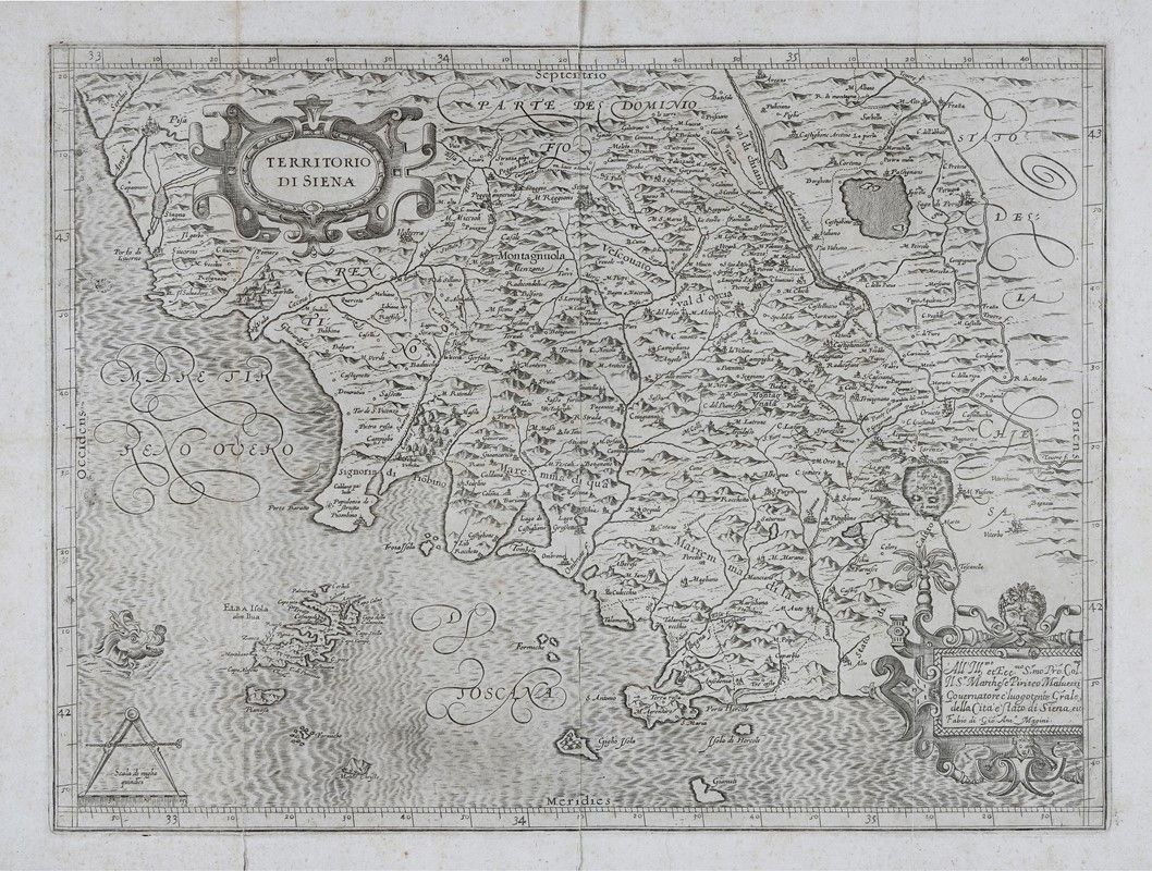 Incisione in rame. mm 350x464. Foglio: mm 422x570. Titolo nel cartiglio in alto a sinistra, in basso a destra dedica al Marchese Piriteo Malvezzi governatore e luogotenente generale di Siena. Da L’Italia a cura di Fabio Magini, edita a Bologna nel 1620, dopo la morte del padre.
