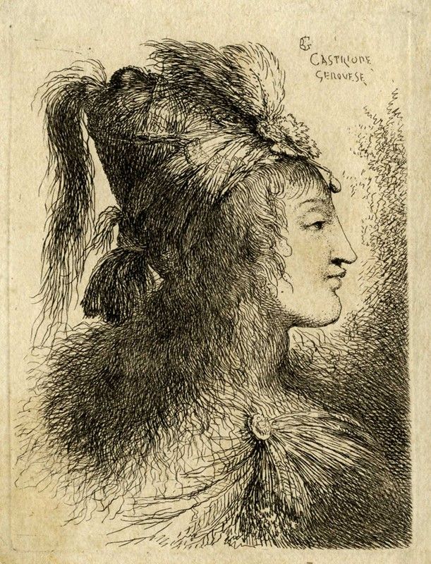 Acquaforte. mm 110x82. Foglio: mm 120x90. Bartsch, 47. Bellini (Castiglione), 38. In alto a destra il monogramma e "CASTILIONE / GENOVESE". Tavola dalla serie cosiddetta dei Piccoli ritratti iniziata probabilmente a Genova e poi continuata a Roma databile pertanto tra il 1645 e il 1650. Ottima impressione nell'unico stato su carta vergellata lievemente rigida e priva di filigrana.