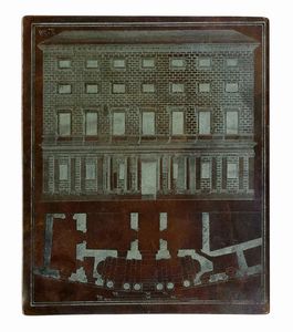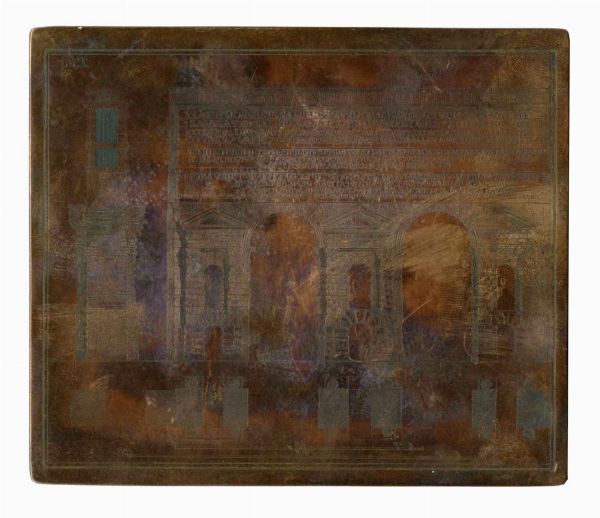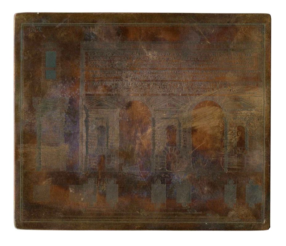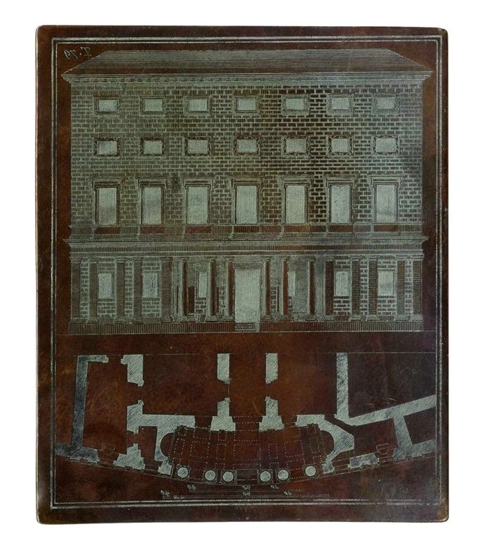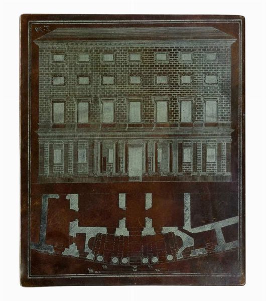 Lastra in rame. cm 13x11. Tre lastre in rame incise con prospetti, facciate, piante e spaccato di edifici, presumibilmente per volume di architettura.