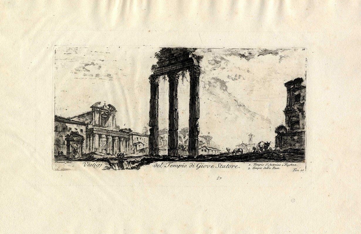 Acquaforte. mm 133x269. Foglio: mm 265x400. Hind, 10. Firmata nel margine inferiore a sinistra e numerata "Tav. 10" a destra. Decima tavola da Antichità romane de' tempi della Repubblica, e de' primi imperatori...(Alcune vedute di Archi Trionfali, ed altri monumenti), serie in 30 tavole edita per la prima volta attorno al 1748. Bellissima impressione su carta vergellata sottile priva di filigrana.