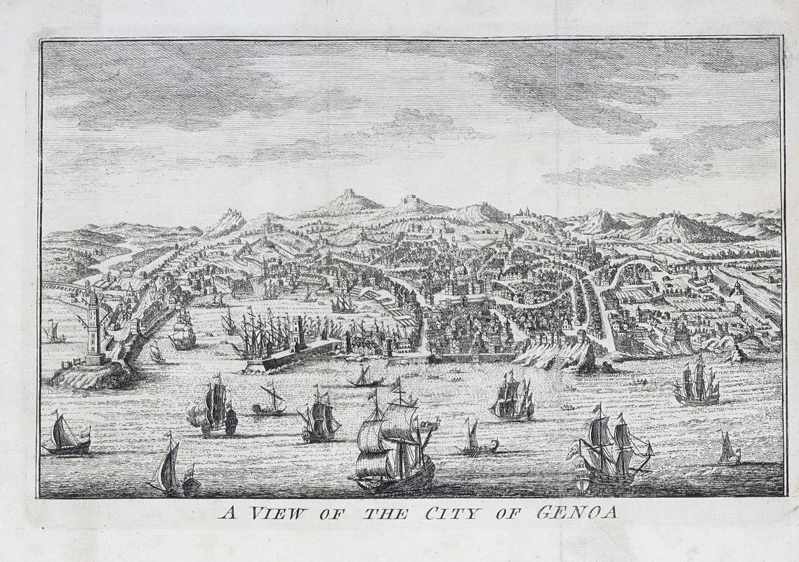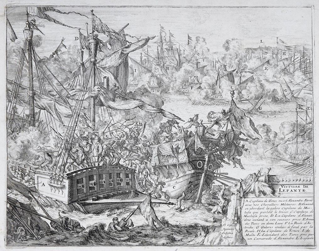 Acquaforte. mm 270x345. Foglio: mm 284x360. Tavola tratta da disegno di Don Juan de Ledesma proveniente dalla serie Guerres de Flandres. Il soggetto raffigura la flotta della Lega Santa (con navi provenienti dalla Repubblica di Venezia, dalle galee dell'Impero spagnolo con il Regno di Napoli e il Regno di Sicilia, dello Stato Pontificio, e della Repubblica di Genova) comandata da Don Giovanni d'Austria che sconfigge i Turchi nella battaglia navale di Lepanto il 7 ottobre 1571. SI AGGIUNGONO: XVII-XVIII secolo. Due vedute di Genova. Incisioni in rame. mm 170x245/268. Foglio: mm 202/210x285/305.