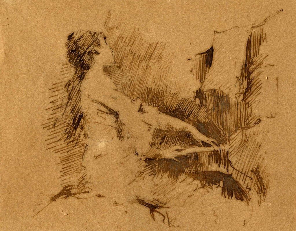 Penna e inchiostro di china bruno su cartoncino. mm 117x145 (visibili). Meraviglioso preparatorio per l'omonimo dipinto scapigliato.
