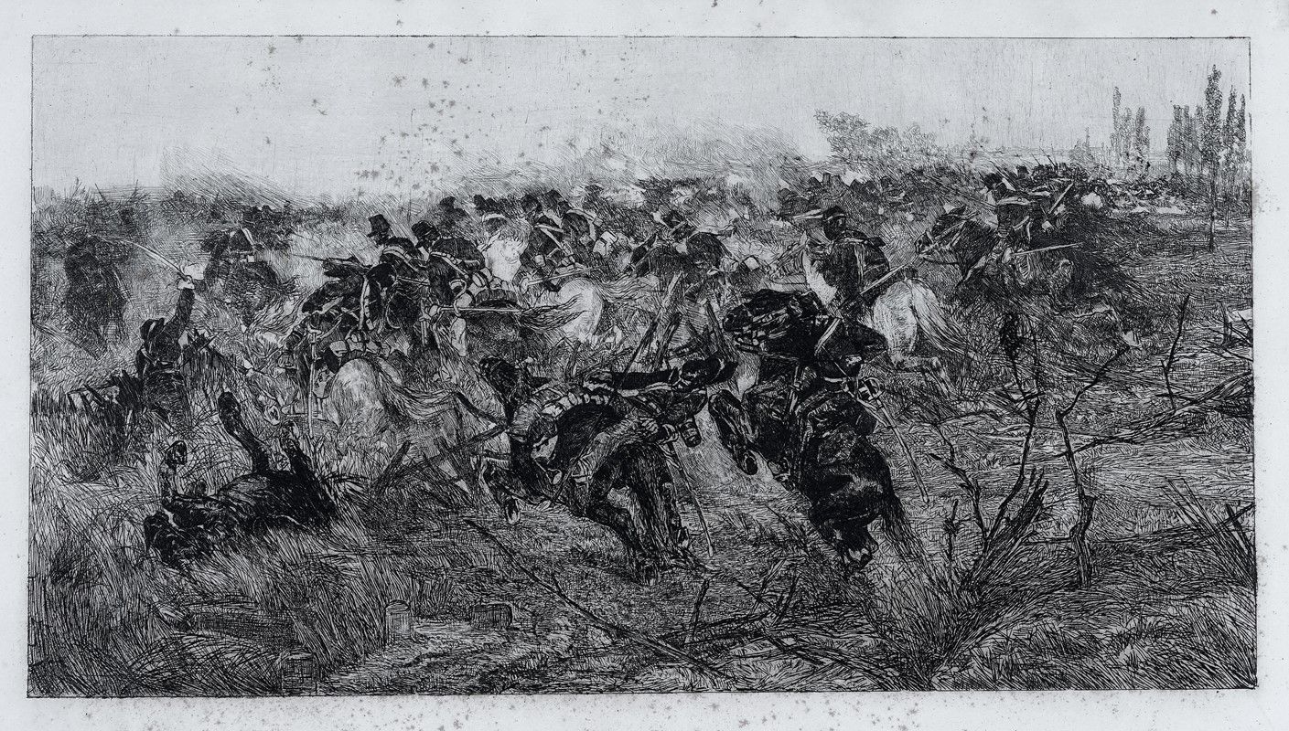 Acquaforte su rame. mm 252x467. Foglio: mm 348x540. Baboni, CLXXVIII. Bonagura, 22. Timpanaro, 11. Esemplare nel I stato su 2. La lastra fu incisa per la Società delle Belle Arti di Firenze sul tema del dipinto Carica del 1872 e tirata una prima volta nel 1884 ed una seconda nel 1889 a 50 esemplari dallo stampatore Gastaldi di Torino.