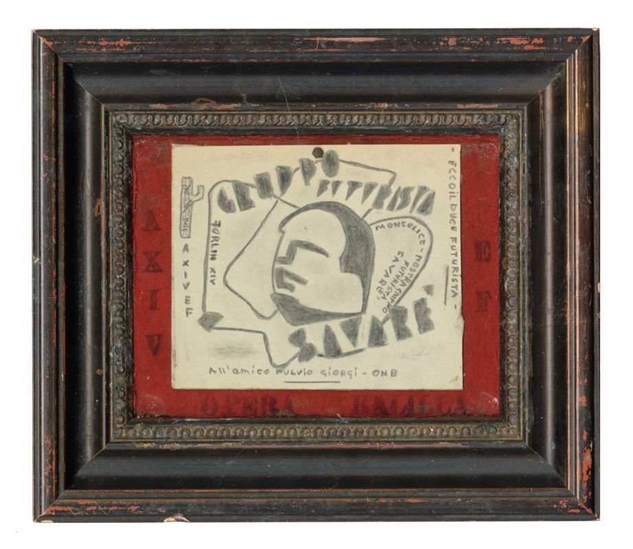 Pastello nero su cartone. cm 11x12,5. Firmato e datato (XIV anno fascista, quindi 1935-36.) al margine sinistro, titolato al destro e dedicato "All'amico Fulvio Giorgi-ONB" all'inferiore. Iscritto: "Gruppo futurista Savarè" e "Monselice". Al verso della cornice applicato un foglio iscritto con intestazione "Camera dei Fasci e delle Corporazioni. Direzione generale degli uffici di questura".