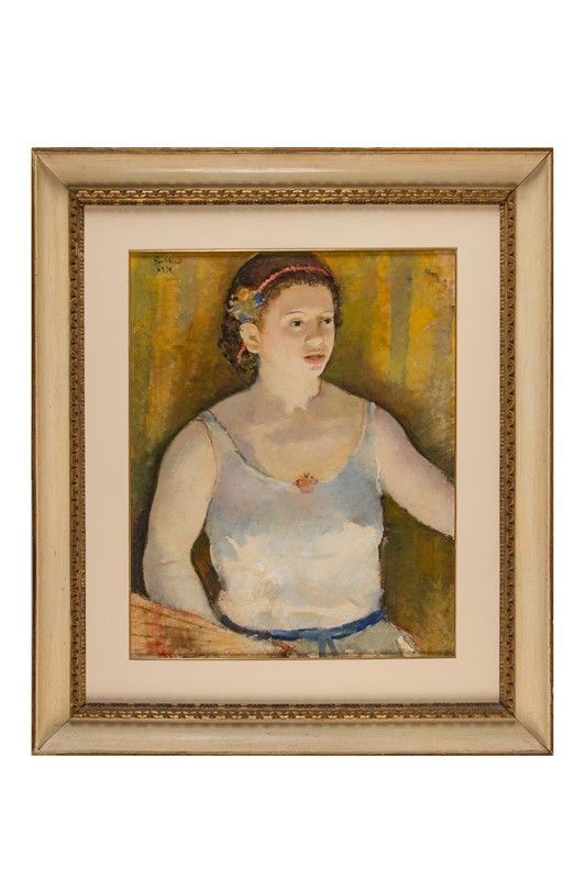 Olio su tela. cm 68x50. Firmato e datato in alto a sinistra. L'opera è accompagnata da autentica su fotografia da parte degli Archivi Riuniti - Laura Turco Liveri, rilasciata a Roma il 15 Novembre 2022. Provenienza: P. Laghi, Faenza; collezione privata, Faenza; collezione privata, Castel San Pietro Terme; collezione privata, Firenze. La ragazza ritratta è la giovane assistente di Maria Gentilini, sorella di Franco Gentilini, che all'epoca era sarta.