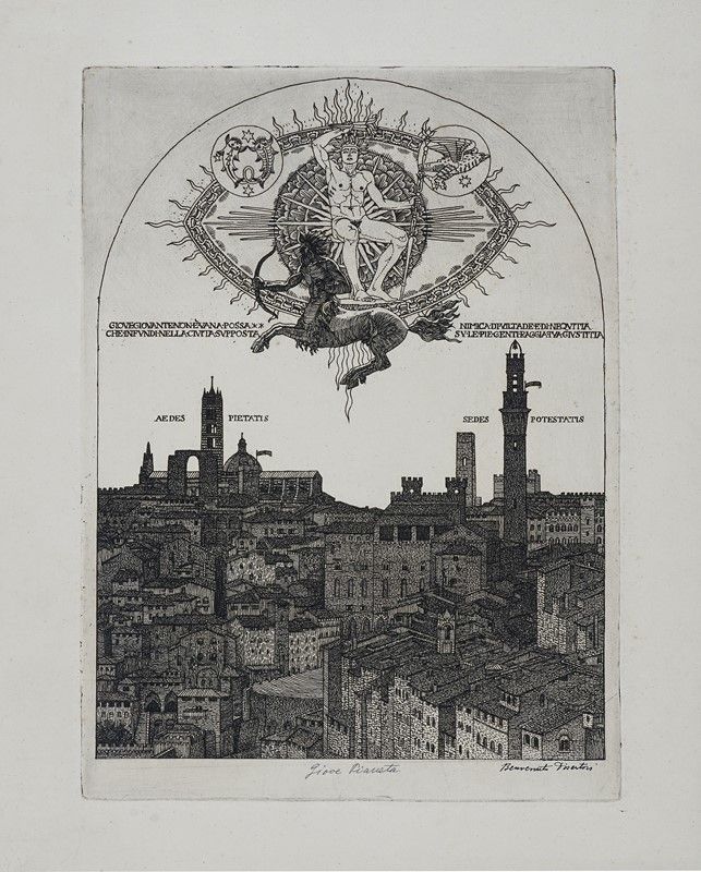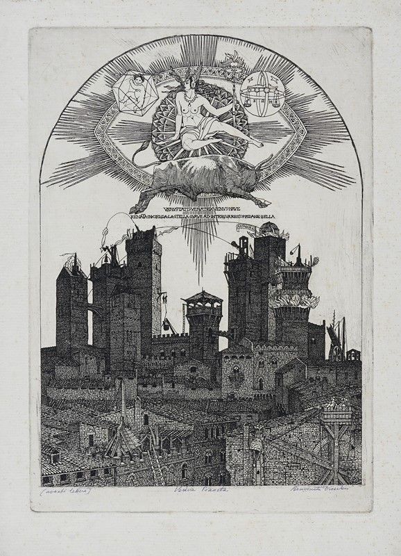 1) Il pianeta Giove. 1924. Acquaforte e bulino. mm 373x274. Foglio: mm 500x410. bellini-alberti, 44. Firmata a penna e inchiostro di china in basso a destra e titolata a penna a sfera blu al centro. 2) Il pianeta Venere. 1924. Acquaforte e bulino. mm 407x294. Foglio: mm 485x366. bellini-alberti, 45. Firmata a penna a sfera in basso a destra, titolata al centro e "(avanti lettera)" in basso sinistra. 3) Il pianeta Mercurio. 1947-48. Acquaforte e bulino. mm 414x288. Foglio: mm 500x355. bellini-alberti, 61. Firmata a penna e inchiostro di china in basso a destra. Al verso timbro dell'artista e titolata. Provenienza: Eredi Disertori. Come si apprende da numerosi passi del carteggio di Disertori con C. Olschki, era intenzione dell'artista completare la serie con i pianeti rimanenti.