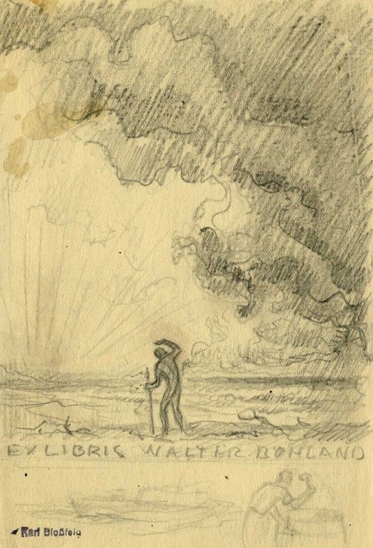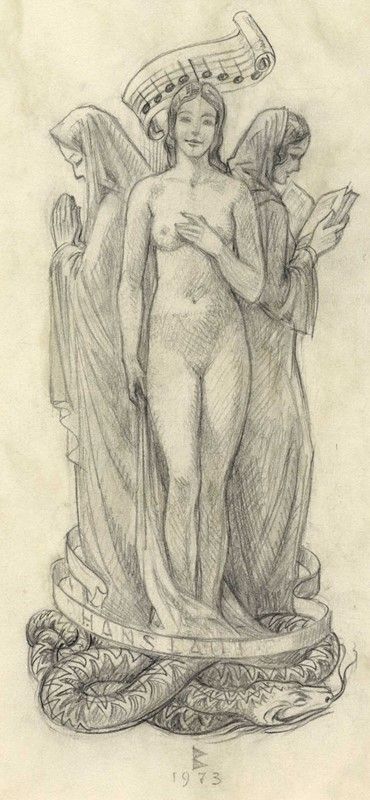 Raccolta di 3 disegni preparatori a matita per ex libris. mm 140/147x98/107. Tutte con timbro dell'artista in basso a sinistra. SI AGGIUNGONO: 1) Id., Ex libris Dr. mes. Gunther Ertel. Acquaforte. mm 115x72. Foglio: mm 200x150. Firmato a matita in basso a destra, timbro dell'artista al verso. Incisione finale dei disegni preparatori descritti precedentemente. 2) Anonimo del XX secolo, Senza titolo. Matita su carta applicata a cartone. mm 280x212. Monogrammato e datato 1973 al margine inferiore.