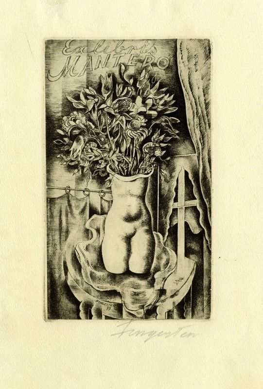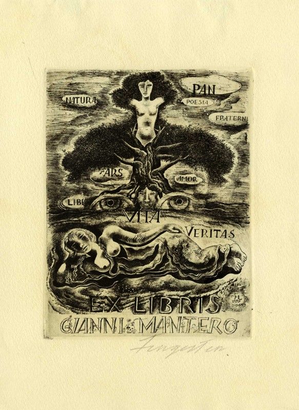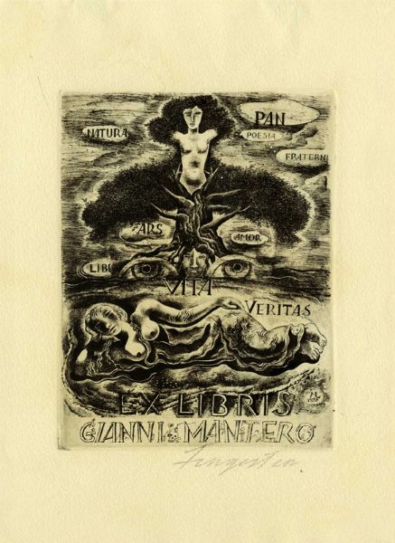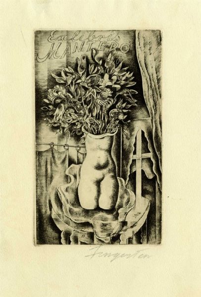 1) Ex libris Mantero (Weiblicher torso ais vase). Acquaforte. mm 162x95. Foglio: mm 230x155. NECHWATAL, P 39. Firmata a matita in basso a destra, controfirmata e datata '37 in lastra in basso. 2) Ex libris Gianni Mantero. Vita, veritas, ars, amor, natura, pan, poesia. Acquaforte. mm 164x100. Foglio: mm 210x155. MIRABELLA-BARDAZZI-BALLERINI, 350. Firmata a matita in basso a destra, siglata e datata 1939 in lastra in basso a destra. 3) Mantero ex libris. Acquaforte. mm 150x100. Foglio: mm 230x155. DEEKEN, 429. Firma a matita in basso a destra, tiratura in basso a sinistra. Es. 40/50. 4) Ex libris et musicis Mantero. Acquaforte. mm 150x103. Foglio: mm 180x117. MIRABELLA-BARDAZZI-BALLERINI, 254. Firma a matita in basso a destra, controfirma in lastra in basso a sinistra. Timbro dell'artista al verso.
