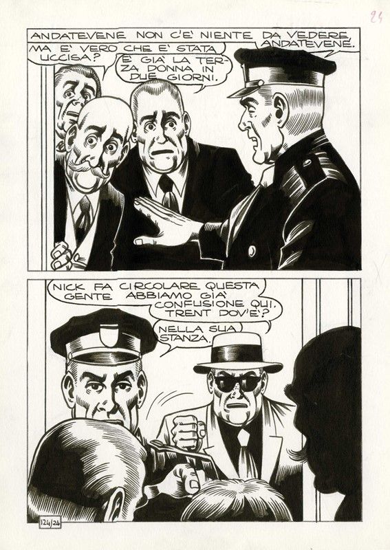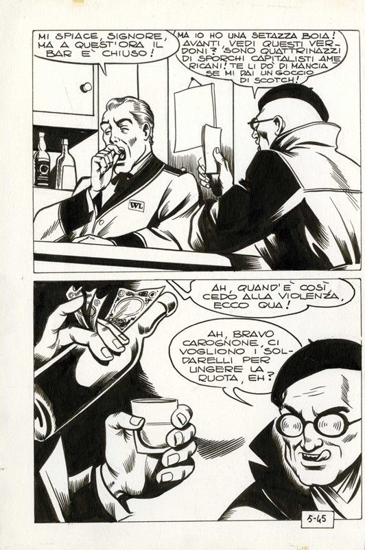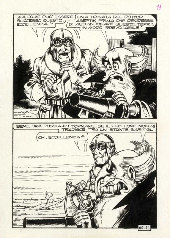 Pennarello e inchiostro di china su carta. mm 255x180 cad. Le tavole recano il numero di edizione e pagina sul lato inferiore del foglio. tre tavole presentano un timbro a secco in alto a sinistra e due fogli due piccole parti a collage, ovvero una numerazione e un fumetto. Nel 1967, Magnus e Bunker danno vita a un nuovo personaggio, Alan Ford, che esordirà nel maggio del 1969. Le tecniche di disegno di Magnus e l'uso del bianco e nero per ricreare particolari atmosfere creano le basi per un nuovo genere di fumetti.
