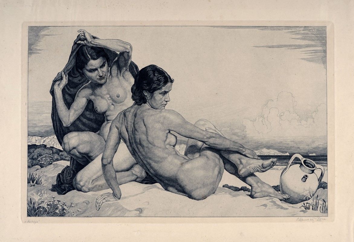 Acquaforte e bulino. mm 332x519. Foglio: mm 430x620. LIPINSKY 1940, n. 32. GROCHALA 1995, n. 19. BARDAZZI 2012, n. 14. Titolata in basso a sinistra, firmata a matita e datata n basso a destra: S. Lipinsky Roma 1936. Nostalgia è l’ultima lastra di grande formato di Lipinsky, in cui usa da gran maestro l’acquaforte portando a un grado di perfezione sia l’effetto pittorico che quello plastico. Vi sono raffigurate due ragazze nude sulla spiaggia, la figlia Eva ed una sua amica. Le loro pose scultoree ricordano la Flora accovacciata di Carpeaux e Il Giorno di Michelangelo. Ne scriveva in merito il figlio Angelo Lipinsky, storiografo critico del padre: Nostalgia significa di più che desiderio, è una sensazione dolce e dolorosa allo stesso tempo, nel senso greco un desiderio quasi morboso per il ritorno verso le origini: non del corpo verso un’origine definibile in categorie geografiche, ma dell’anima staccata dal corpo per essere di nuovo unita nella creazione. Quei momenti rari e preziosi della vita in cui svanisce il tempo e in cui l’anima in una visione momentanea si delizia nel presentimento della sua liberazione, sia di fronte ad una meravigliosa creatura umana, sia nel risuonare di una sinfonia quasi irreale, di fronte a quegli spettacoli naturalistici che si ripetono in un ritmo inalterabile. Le due figure femminili si abbandonano senza inibizione a questa sensazione, posizionate nella sabbia morbida e chiara della spiaggia latina, offrendo i loro corpi robusti ma nobili nudi al vento fresco, legate alla natura, sapienti. Di nuovo, il mare scuro si muove giocosamente contro la spiaggia, i monti, ormai a noi familiari da questo maestro, animano la lontananza, e di nuovo i gigli di San Pancrazio chinano nella brezza leggera i loro calici sopra la sabbia nella quale è leggermente sprofondata una brocca di terracotta. Sono delle ragazze mortali simili a dee che con la loro brocca sono andate al mare, o sono delle ninfe della fontè Una domanda la quale, di fronte alla bellezza e al mistero magico che la trasfigura, si disperde senza ricevere una risposta. Angelo Lipinsky, Sigmund Lipinsky und sein Graphisches Werk, in «Maso Finiguerra», A. V, nn. 1-2, 1940, pp. 138-139.