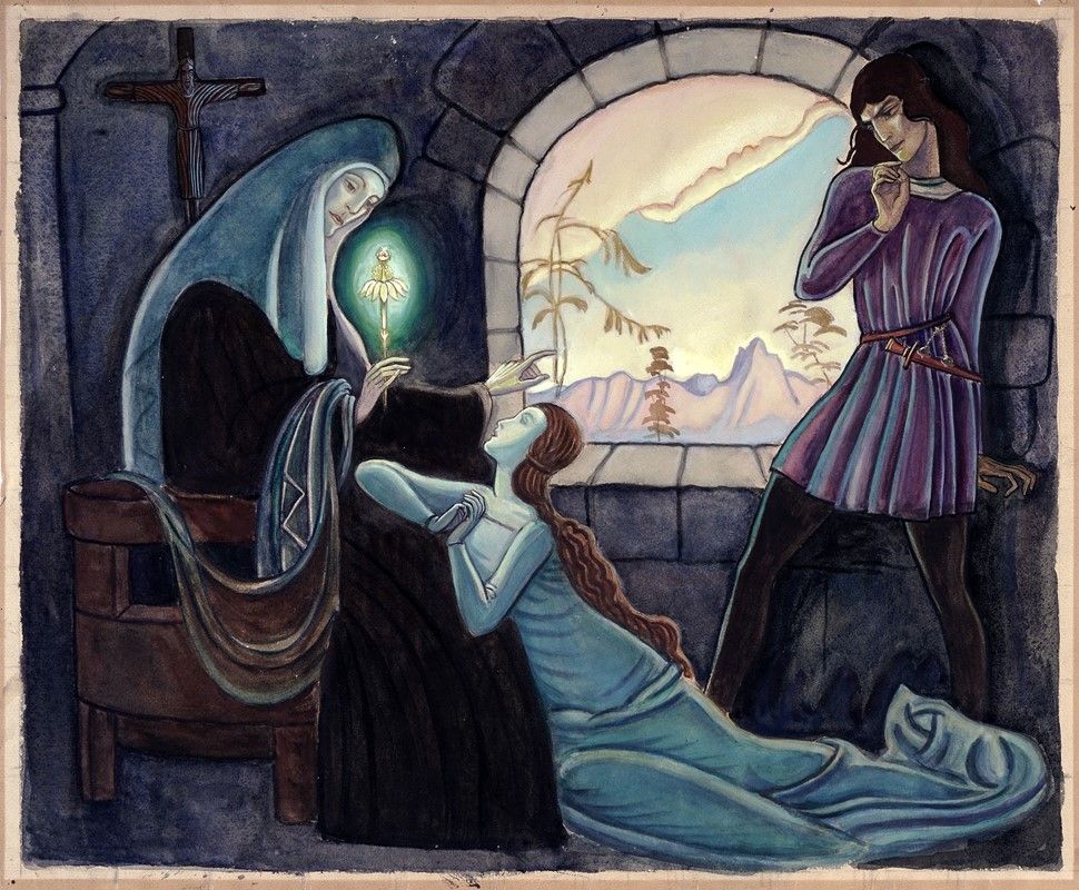 Acquerello su carta greve. mm 505x615. Il presente disegno e quelli a seguire rivelano uno stile diverso rispetto a quello più conosciuto dell'artista, tipico della sua produzione decorativa, umoristica e favolistica legata all'ambiente della Secessione viennese e della Wiener Werkstätte. Non troviamo infatti l'usuale segno calligrafico e minuzioso bensì un utilizzo più dinamico della linea e sintetico delle forme, legato piuttosto all'attività meno conosciuta e occasionale di Wacik nel campo dei costumi e dei bozzetti teatrali.