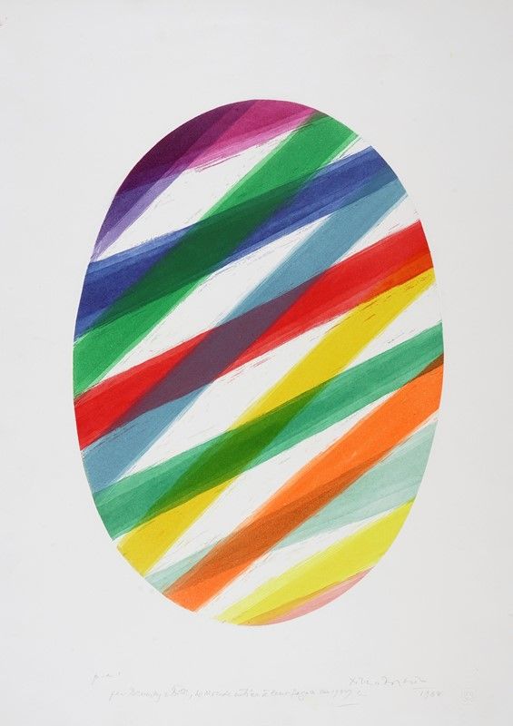 Acquatinta a colori. mm 490x340. Foglio: mm 700x495. simongini, 265. Firmata a matita in basso a destra, in basso a sinistra "p.a." e in basso al centro dedicata: "per Beverly e Bill...". Timbro a secco "gg" in basso a destra, ovvero il timbro della Stamperia dei Greci.